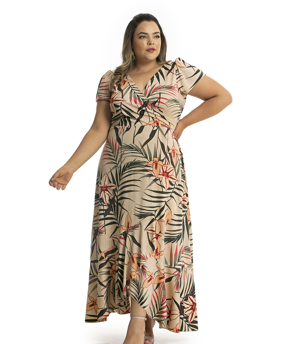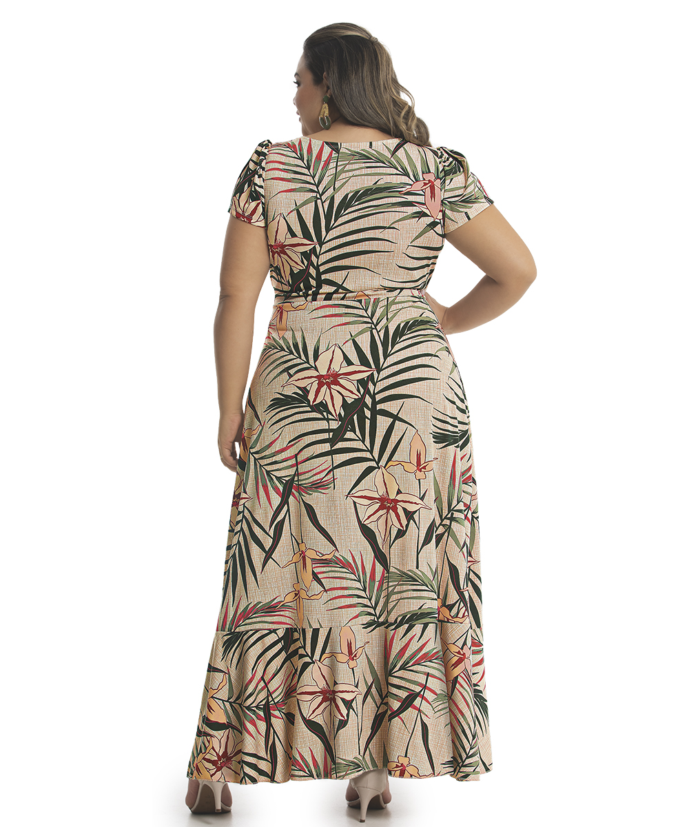 Vestido com decote transpassado, mangas com franzidos e saia com babado sobreposto. Comprimento Longo.
