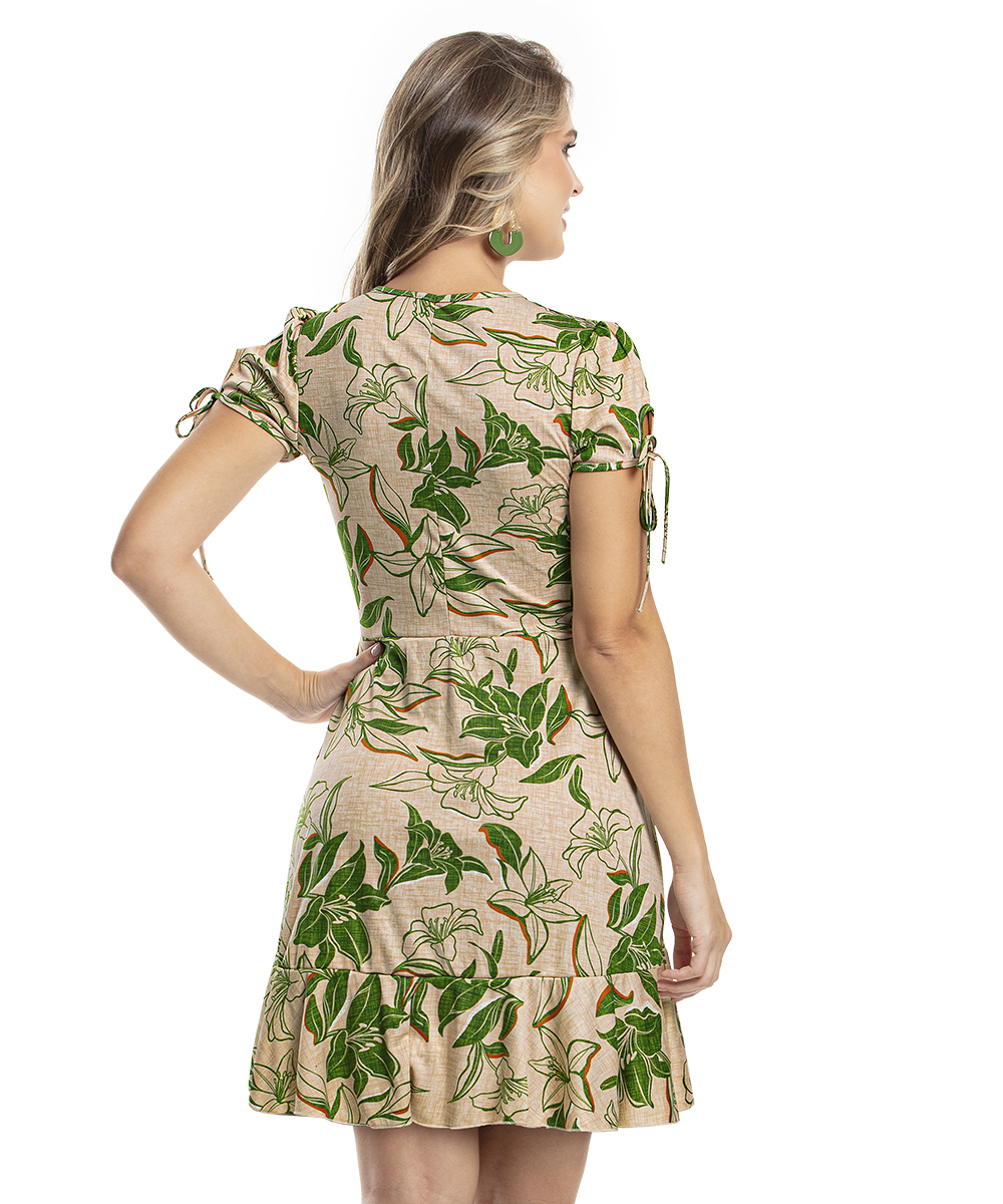 Vestido decote transpassado, mangas curtas com abertura, faixa embutida