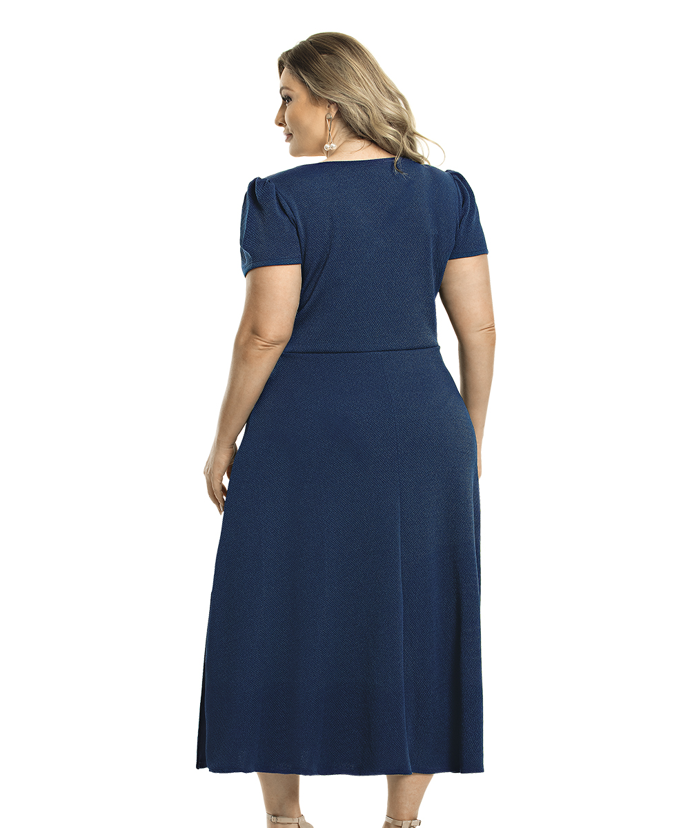 Vestido possui decote transpassado, mangas com franzido, pala na cintura, saia solta da cintura até a barra e fenda frontal. Comprimento Max.