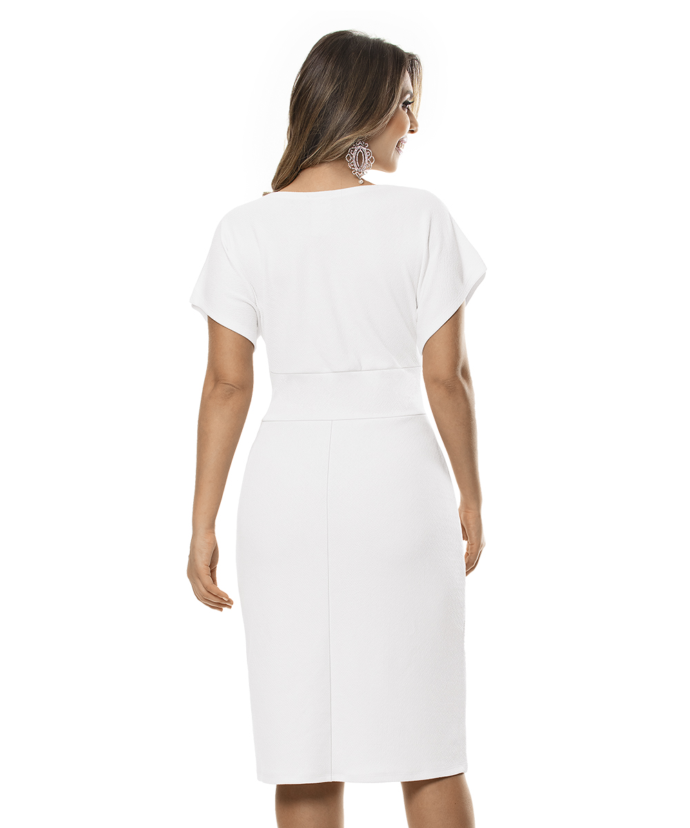 Possui decote V transpassado, mangas soltas no braço, pala na cintura e modelagem da saia justa ao corpo. Comprimento Clássico.
