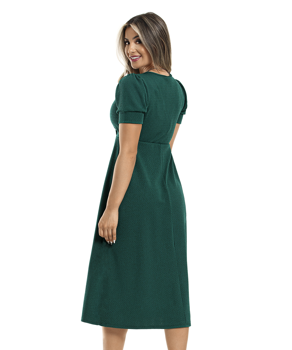 Vestido em malha crepe encorpada com textura possui decote transpassado, mangas bufantes com punho, recorte abaixo do busto, modelagem da saia evasê. Comprimento Midi.