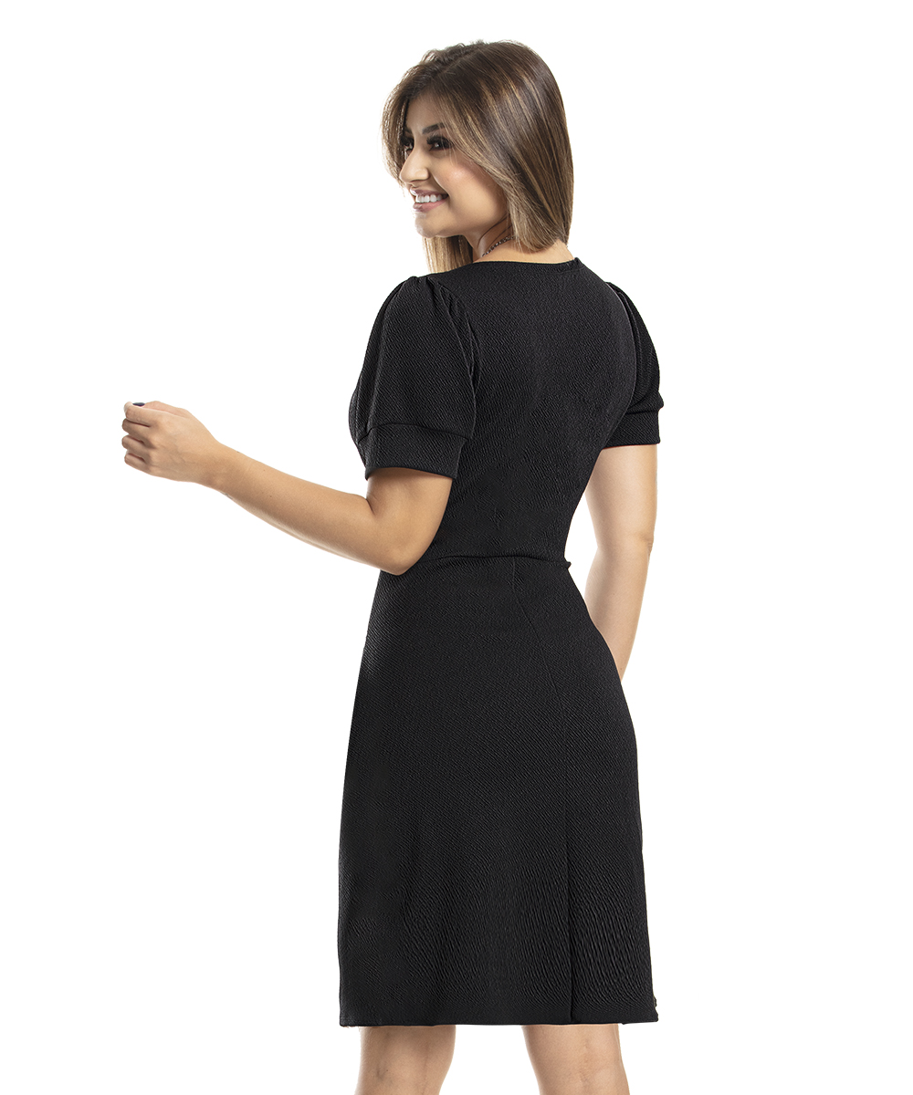 Simplesmente maravilhoso esse vestido, que de básico não tem nada. As mangas franzidas, o decote transpassado em V e a cintura marcada promovem elegância e muita feminilidade. Combine-o com uma sandália de salto delicada para caprichar ainda mais no look.