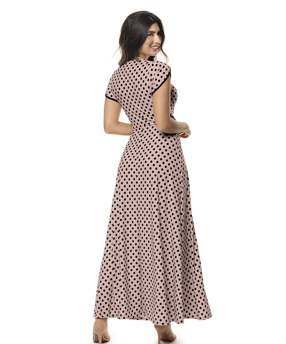 Vestido longo em poá com transpasse que, combinado com os acessórios certos, pode ser usado em diversas ocasiões, sempre garantindo um look impecável e cheio de estilo.