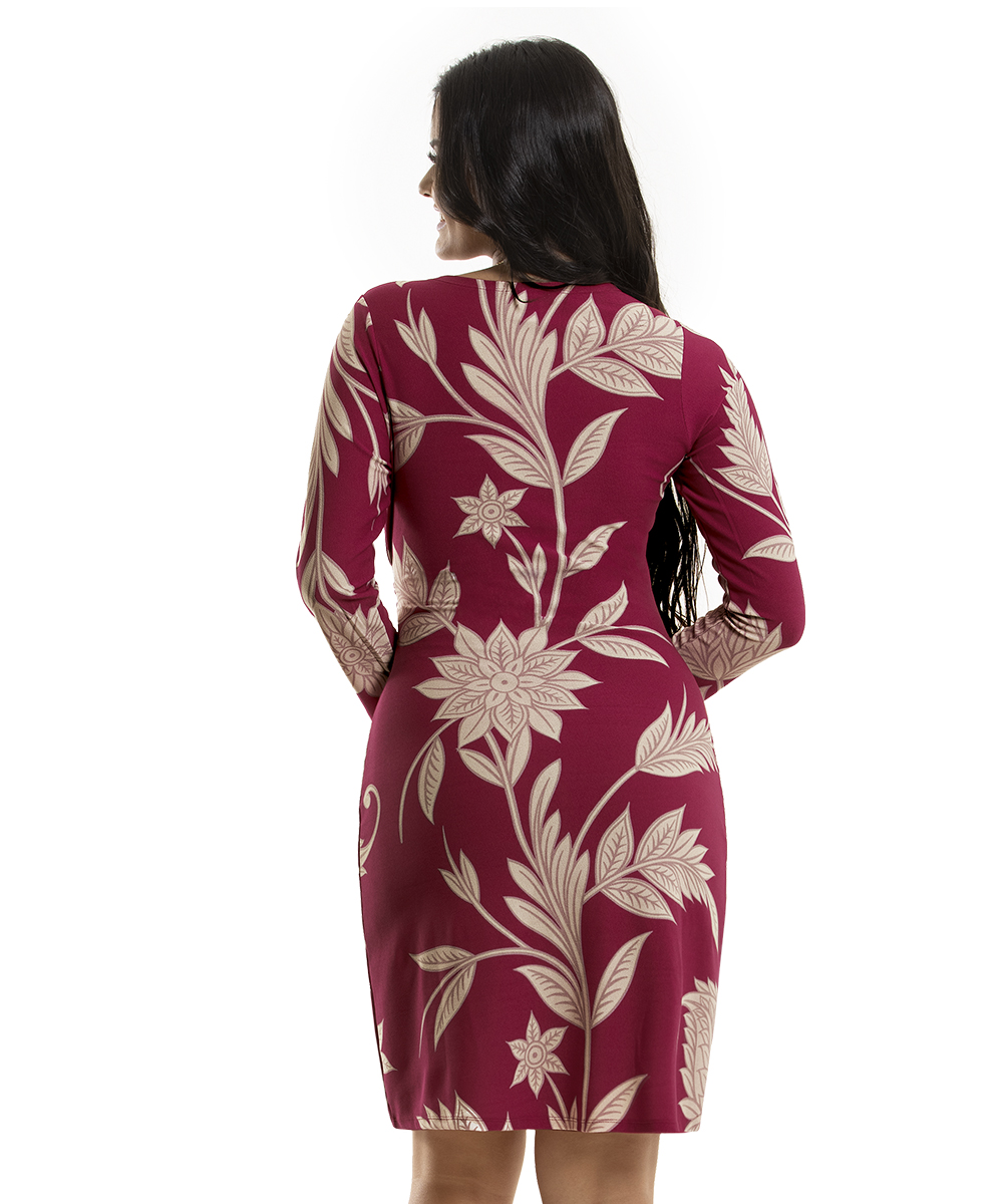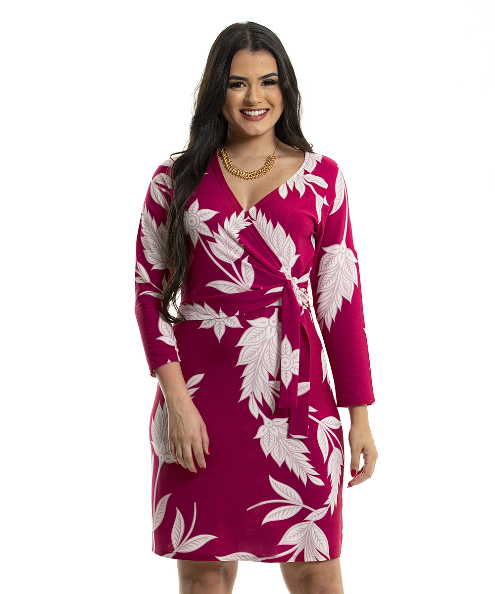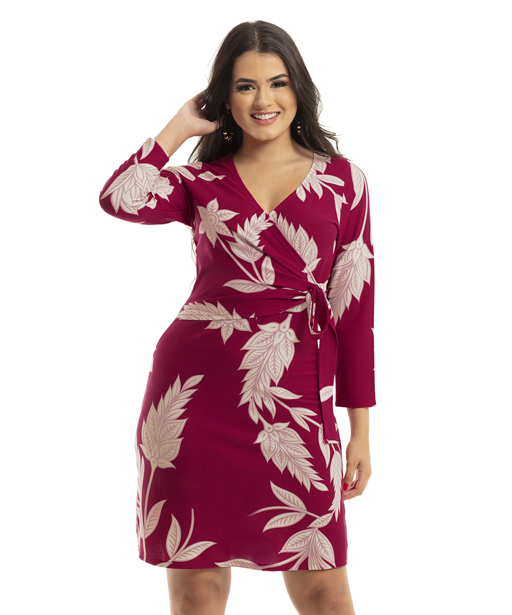 Vestido transpassado, com amarração na lateral da cintura, mangas7/8 e saia próxima ao corpo. Comprimento médio.