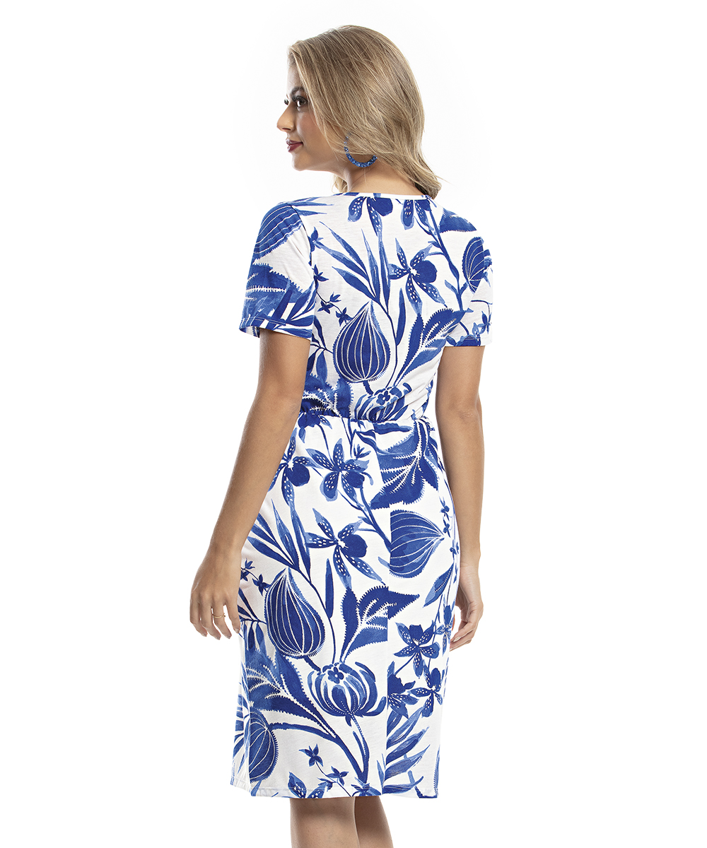 Vestido decote transpassado, mangas curtas, detalhe de blousê na cintura.