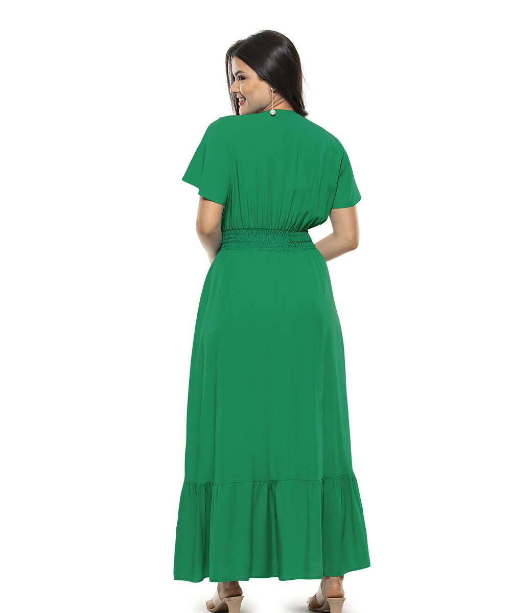 Possui mangas godê, lastex na cintura e modelagem da saia godê com babado franzido. Comprimento Longo.