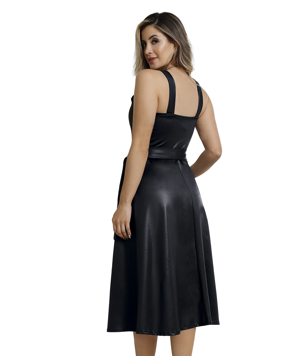 Minimalista e elegante, esse vestido em cirrê é a peça perfeita para ocasiões que merecem um look sofisticado e moderno. O brilho natural do tecido na cor preta dá um toque especial à peça.