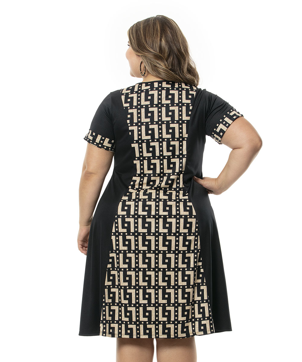 O vestido de estampa geométrica e comprimento clássico com recortes em preto nas laterais é uma peça muito bonita e moderna. A faixa para amarração na cintura é um detalhe que valoriza e define a silhueta, deixando o look ainda mais elegante.