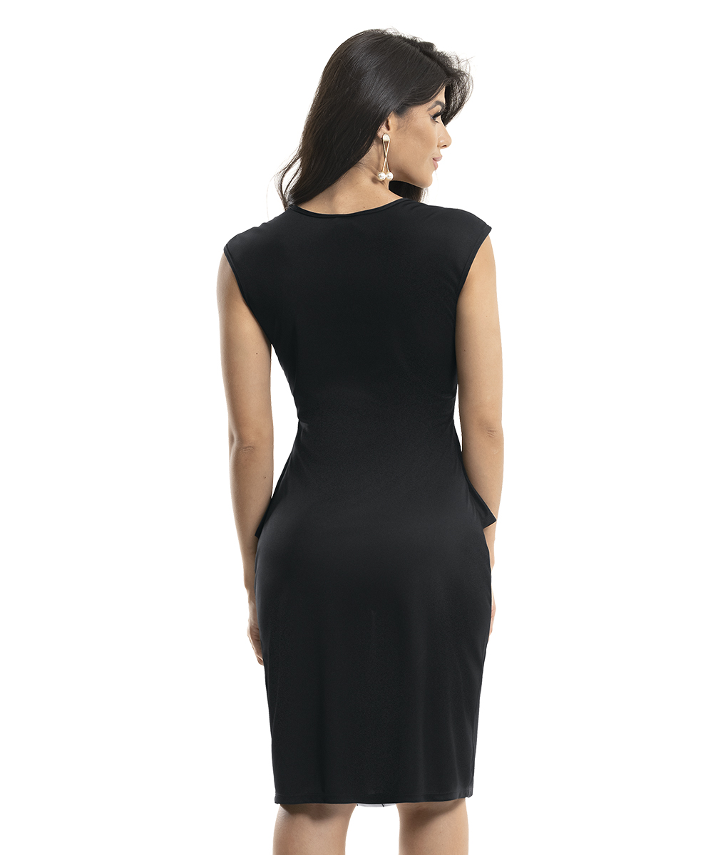Vestido justo com basque nas laterais, recorte xadrez frontal e preto nas laterais e costas. Comprimento clássico.