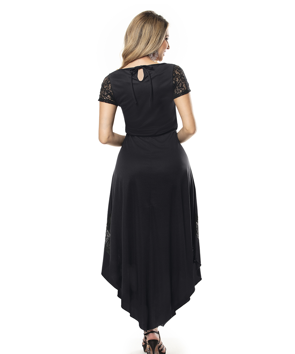 Vestido feito em helanca e renda, possui decote redondo, mangas curtas em renda, aberturas nas costas com faixa embutida e modelagem da saia evasê. Comprimento Longo.