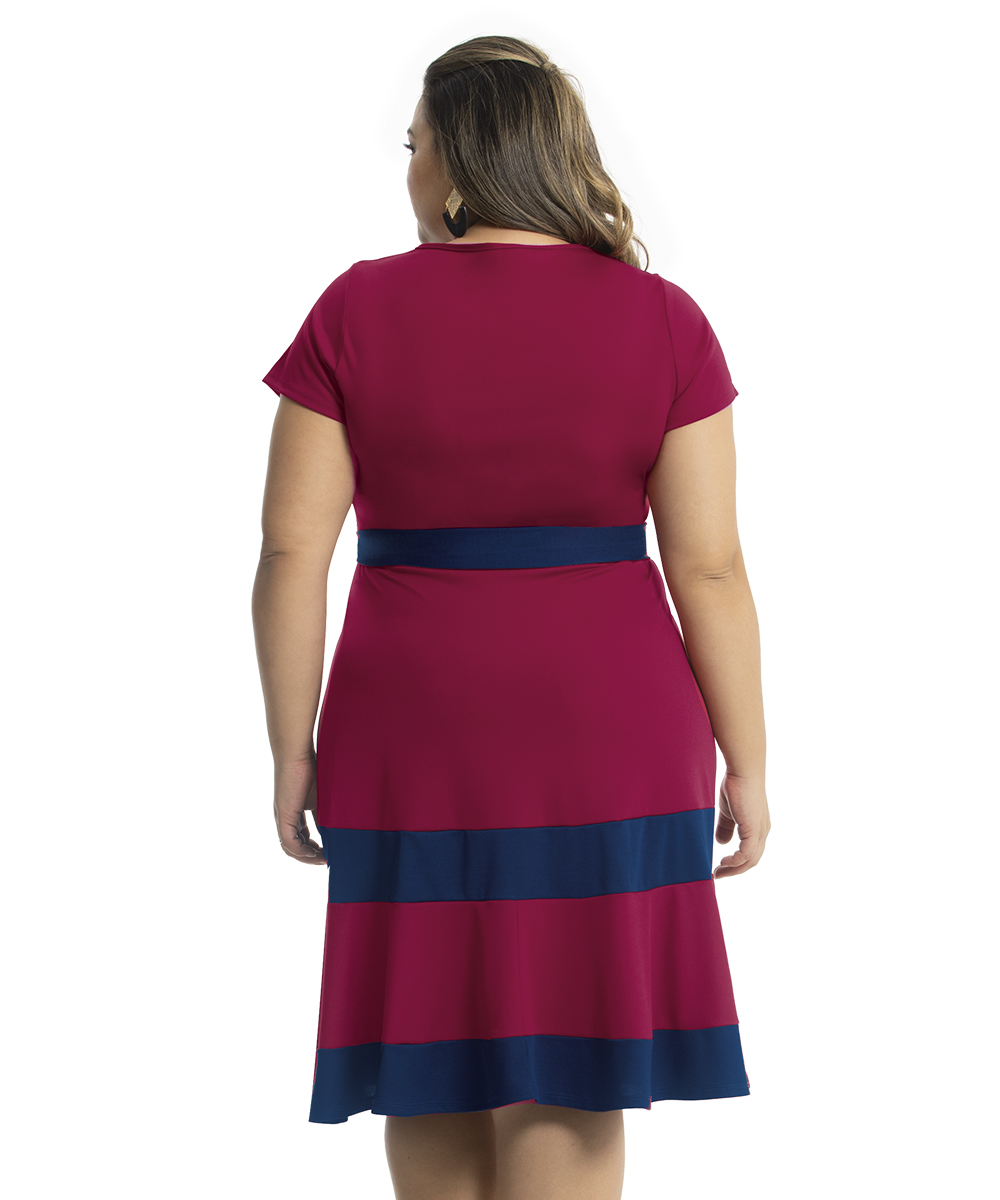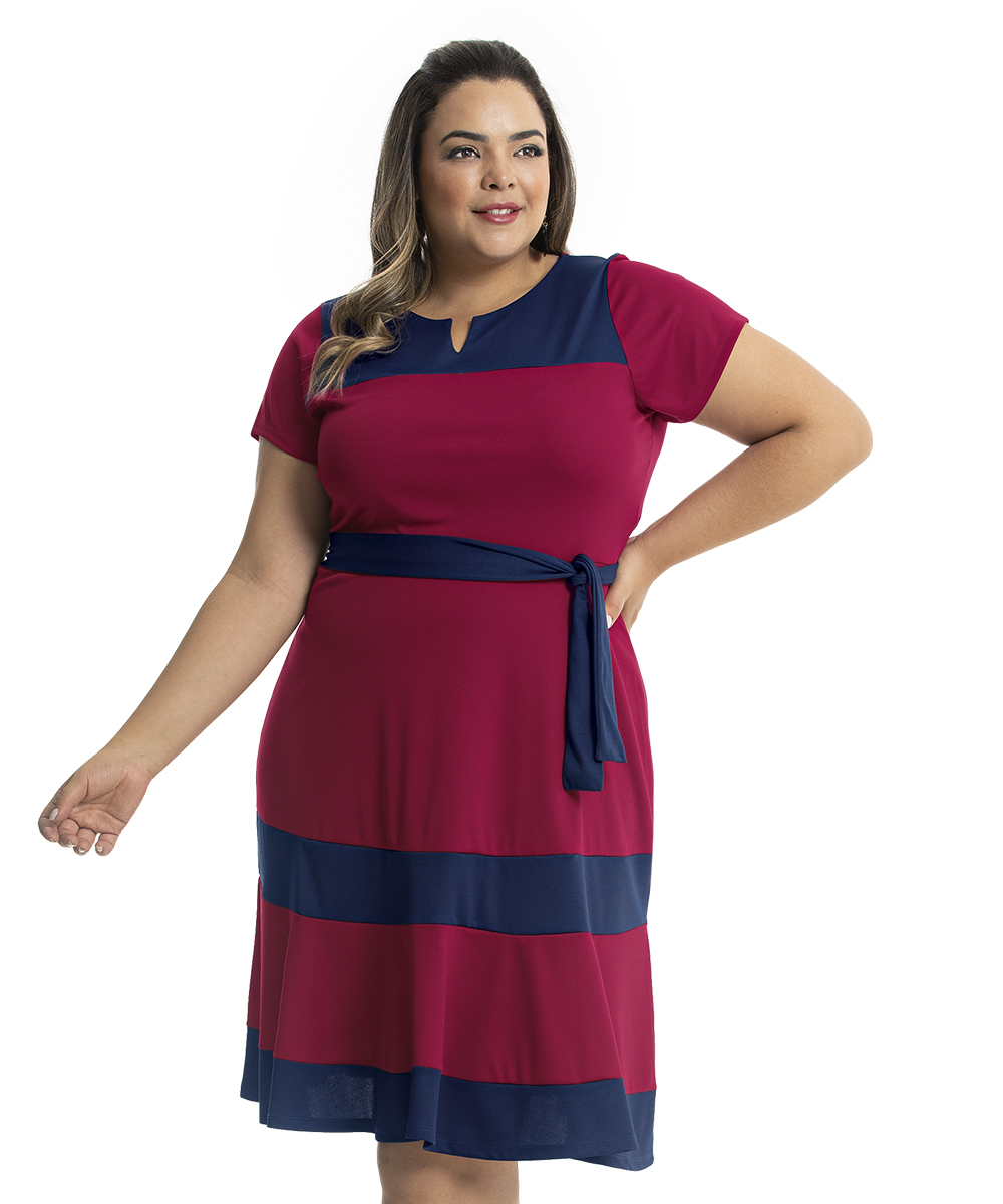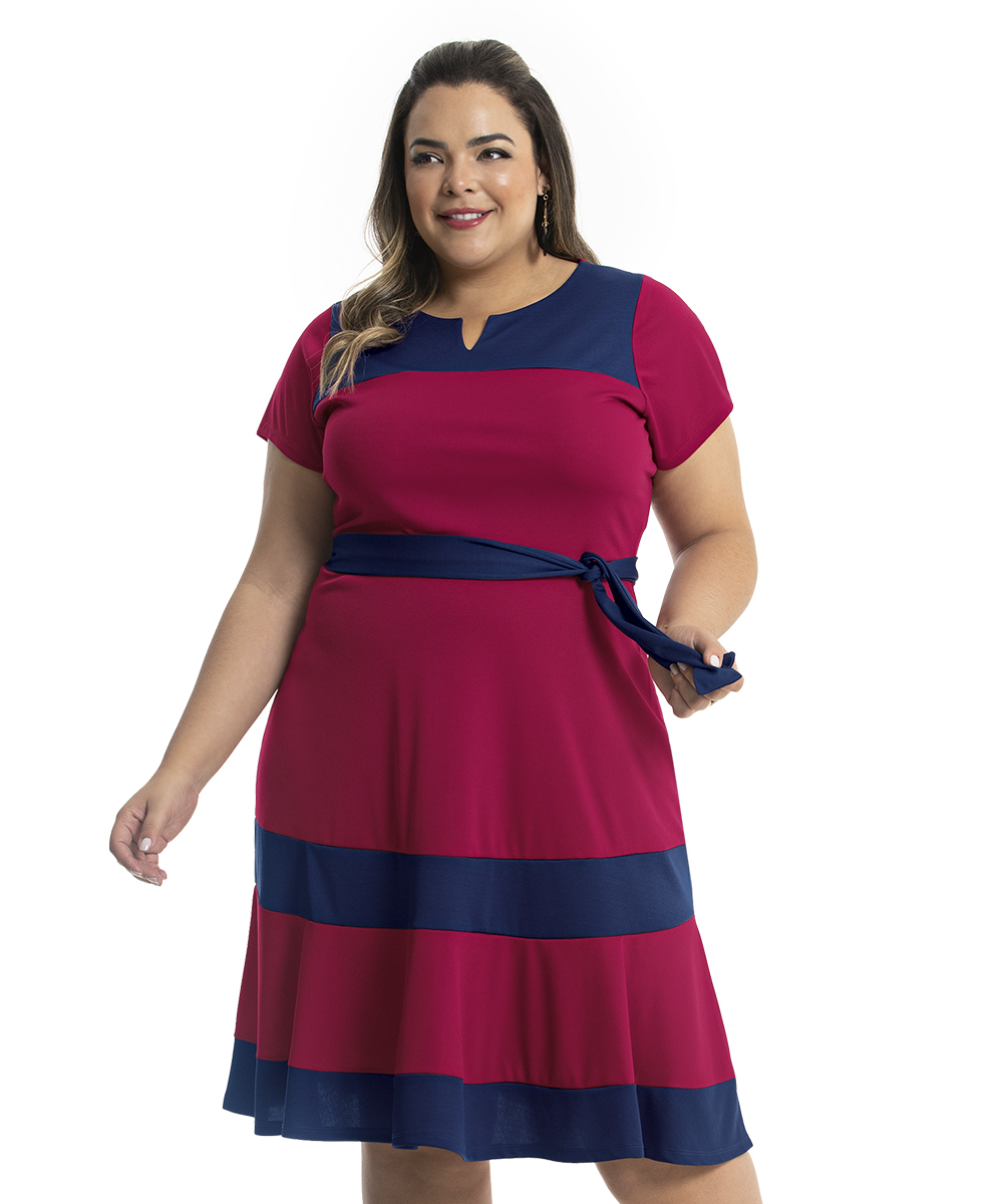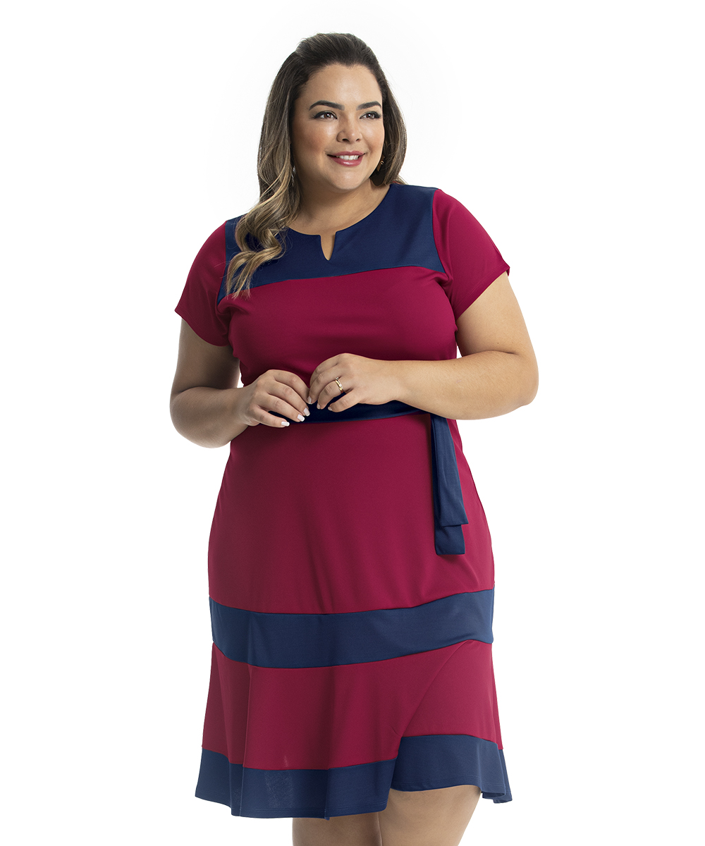 Vestido com recortes em cores contrastantes, decote com abertura, saia soltinha com babado. Acompanha faixa para valorizar a cintura. Comprimento Clássico.