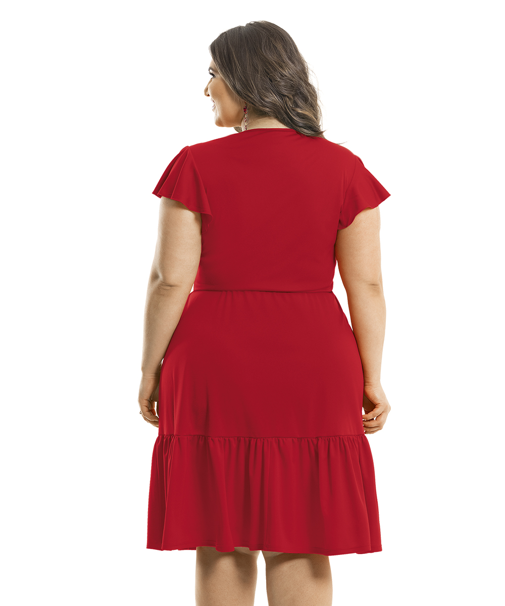 Vestido decote V, mangas godês, efeito blousê na cintura com detalhe de ponteiras, saia godê e babado com franzido. Comprimento clássico.