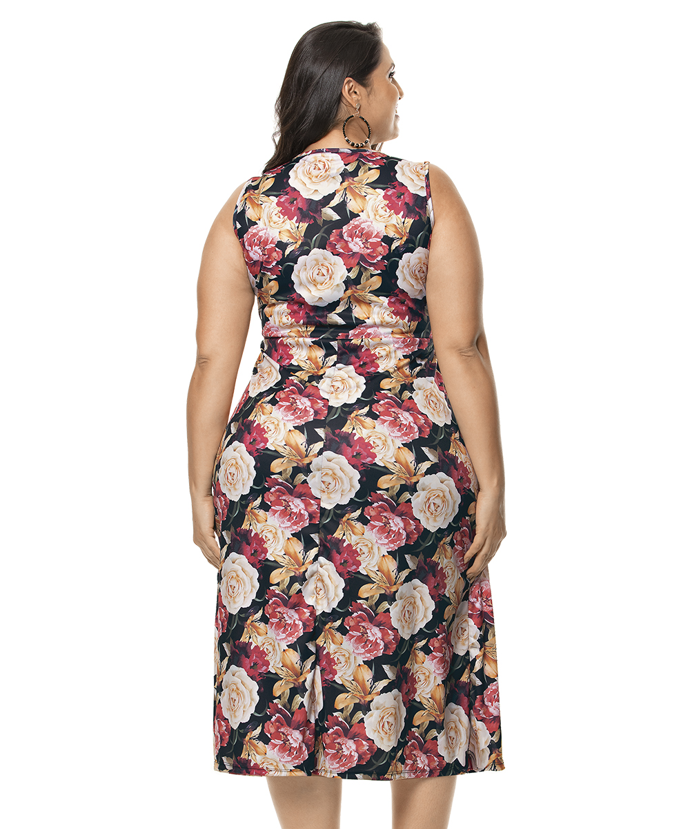 Possui decote redondo, sem manga e modelagem da saia evasê. Comprimento Midi.