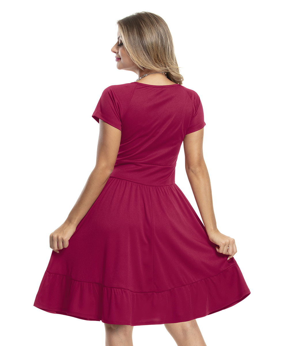 Vestido com decote princesa, mangas curtas, pala na cintura. Modelagem da saia godê com babado franzido. Comprimento Clássico