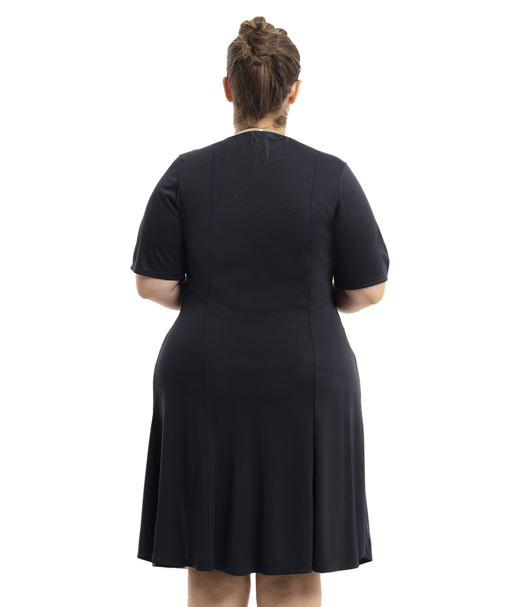 Decote canoa, mangas alongadas e próximas aos braços, saia evasê com nesgas em contraste. Comprimento clássico. Fácil de usar e em tecido maleável com caimento perfeito.