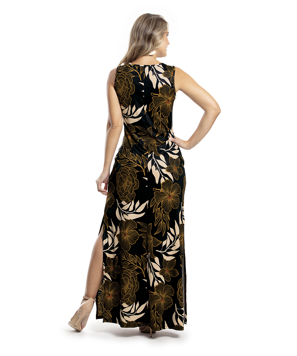 Vestido decote redondo, sem mangas. Modelagem da saia reta com fendas