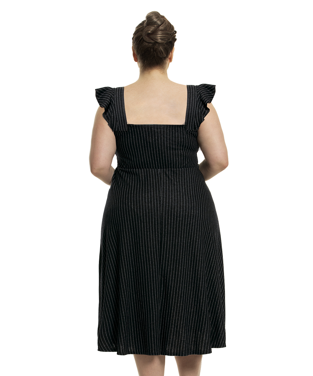 Por falar em classe, olha esse vestido, que charme! Com recorte estruturado e um detalhe super estiloso nas mangas, a peça por si só já é um arraso. Com a estampa risca de giz fica perfeito.
