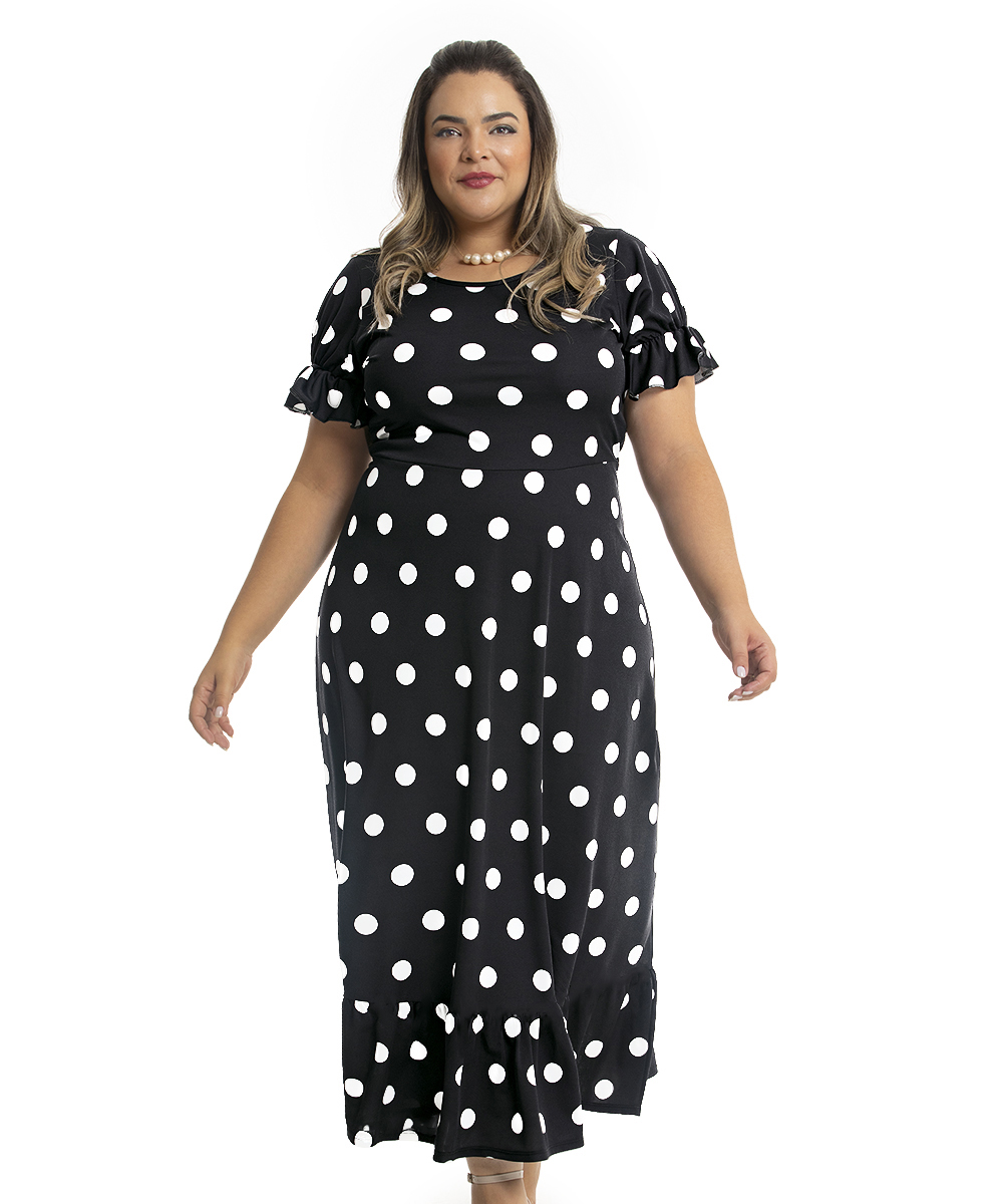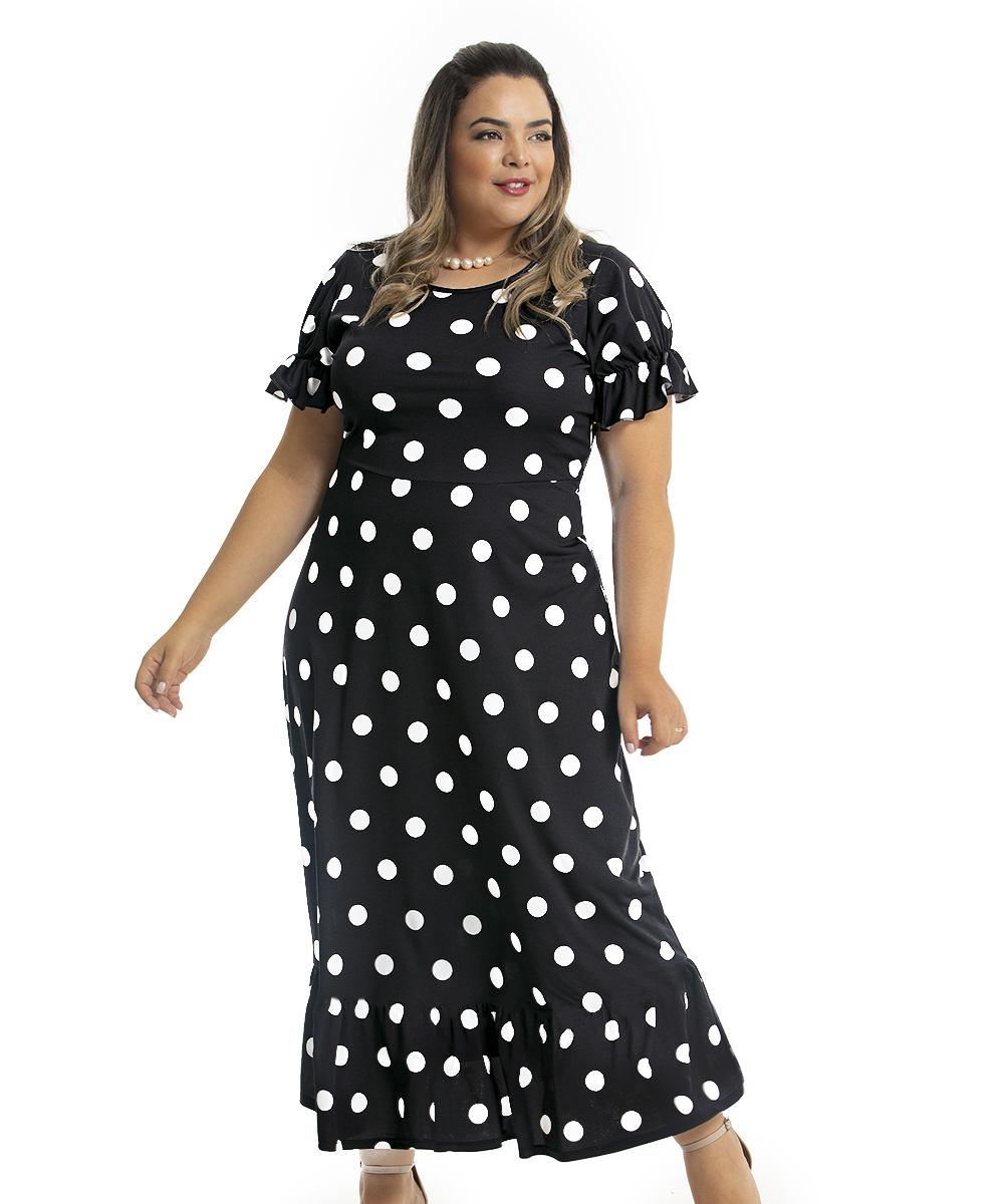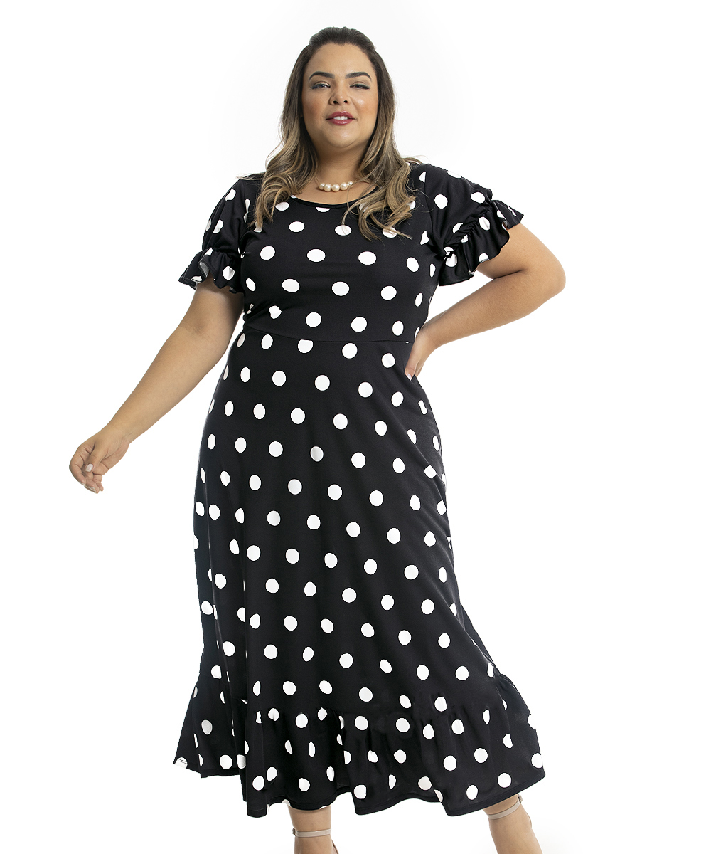 Poá é um clássico! Uma padronagem de estampa, que permite ser usada em qualquer ocasião, desde as mais formais até as casuais. Vestido em jersey acetinado e malha com bom caimento, possui decote redondo, mangas com detalhe de elástico com efeito bufante, recorte na cintura e saia modelagem rodado. Comprimento Max.