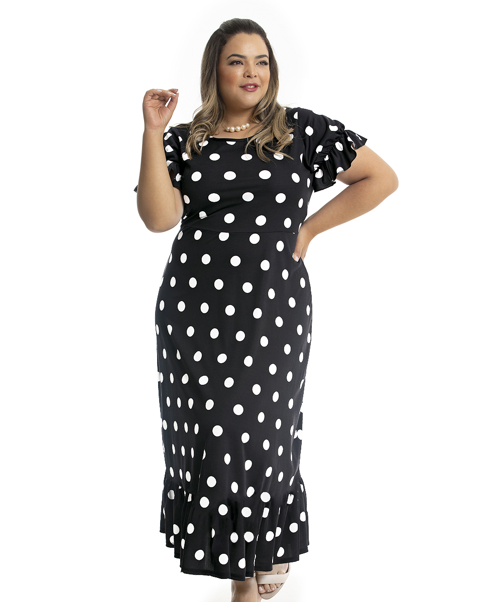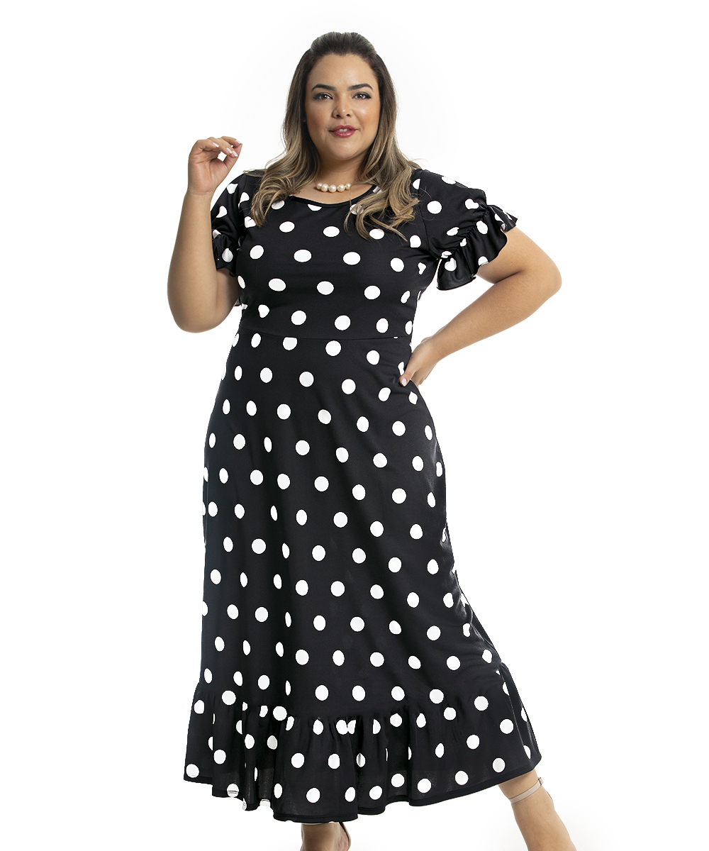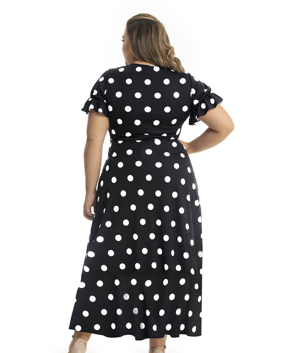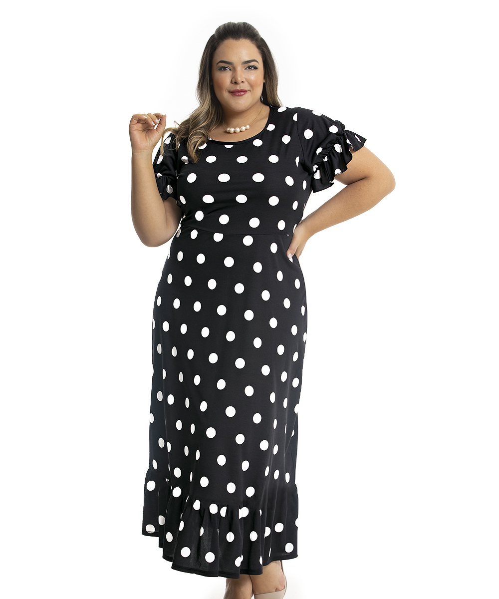 Poá é um clássico! Uma padronagem de estampa, que permite ser usada em qualquer ocasião, desde as mais formais até as casuais. Vestido em jersey acetinado e malha com bom caimento, possui decote redondo, mangas com detalhe de elástico com efeito bufante, recorte na cintura e saia modelagem rodado. Comprimento Max.