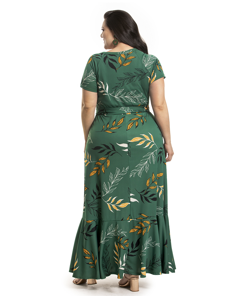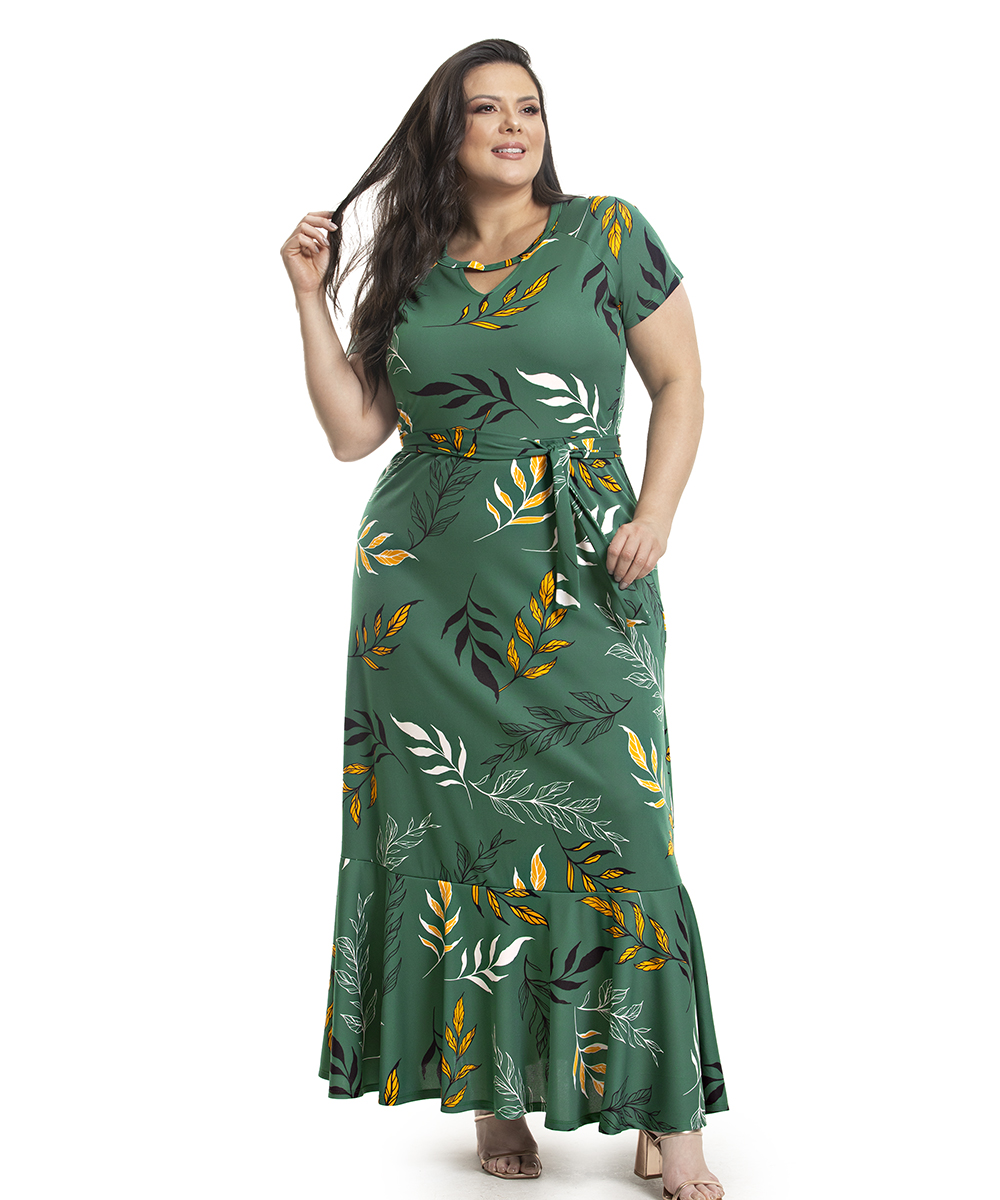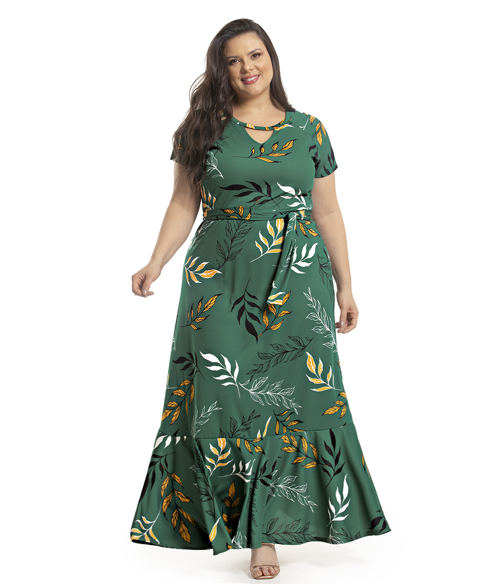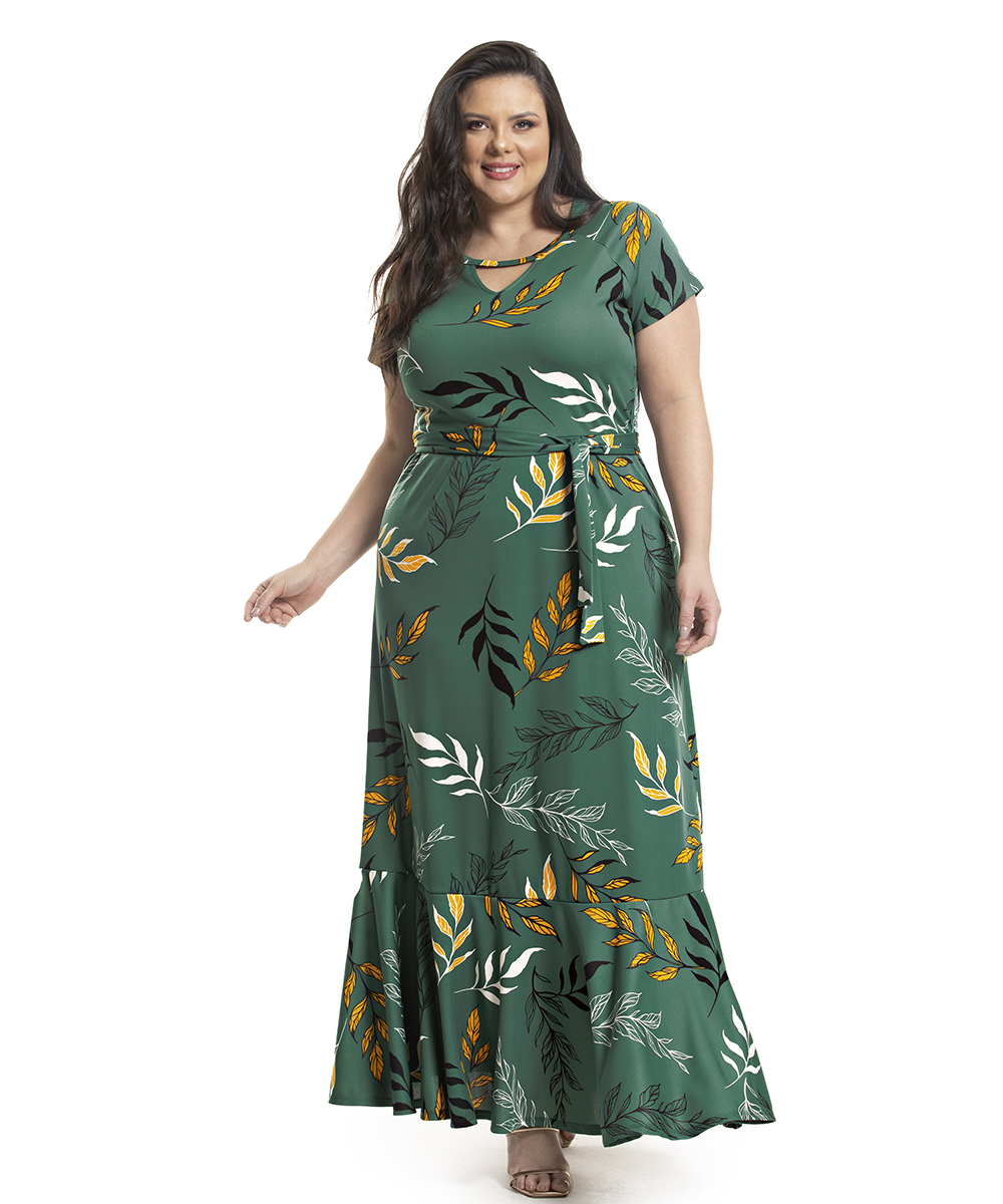 Os vestidos longos são peças confortáveis, além de práticos. Uma peça versátil, podendo ser utilizada em festa, passeios, no trabalho e em muitas outras ocasiões. Estampa de folhagem com fundo alegre e tons harmoniosos.