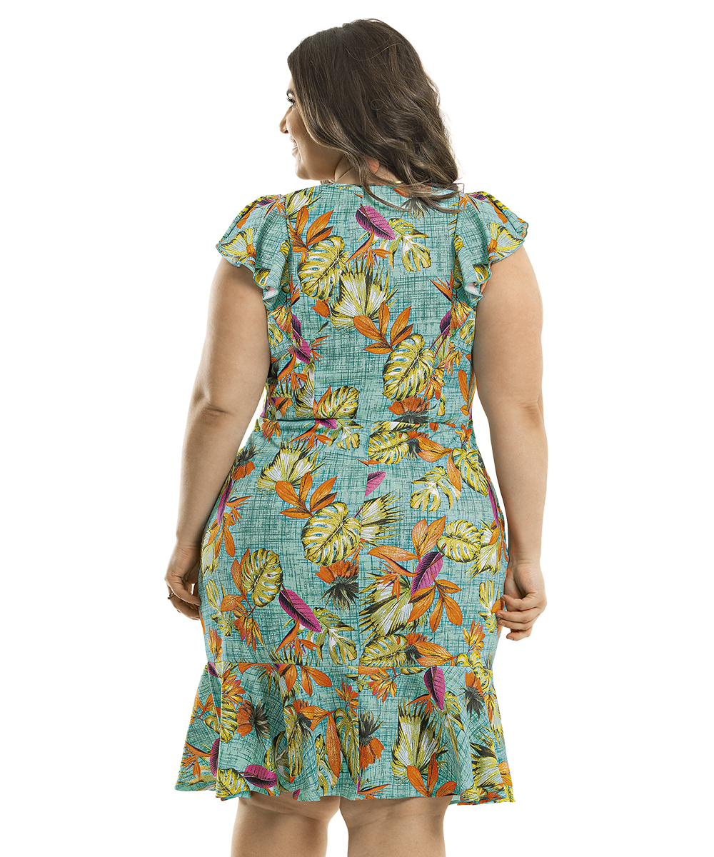 Vestido decote V, mangas godê, modelagem justa e saia com babado. Comprimento Clássico.