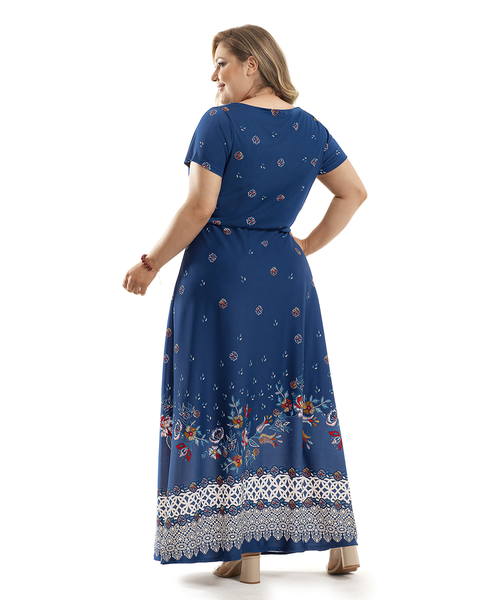 Vestido decote canoa, mangas curtas, efeito blousê na cintura com elástico e detalhe de ponteiras. Saia modelagem com roda. Comprimento Longo.
