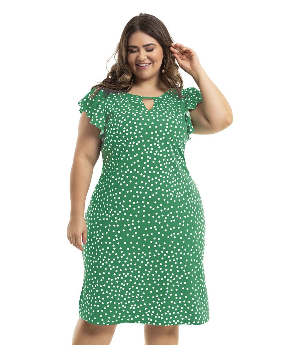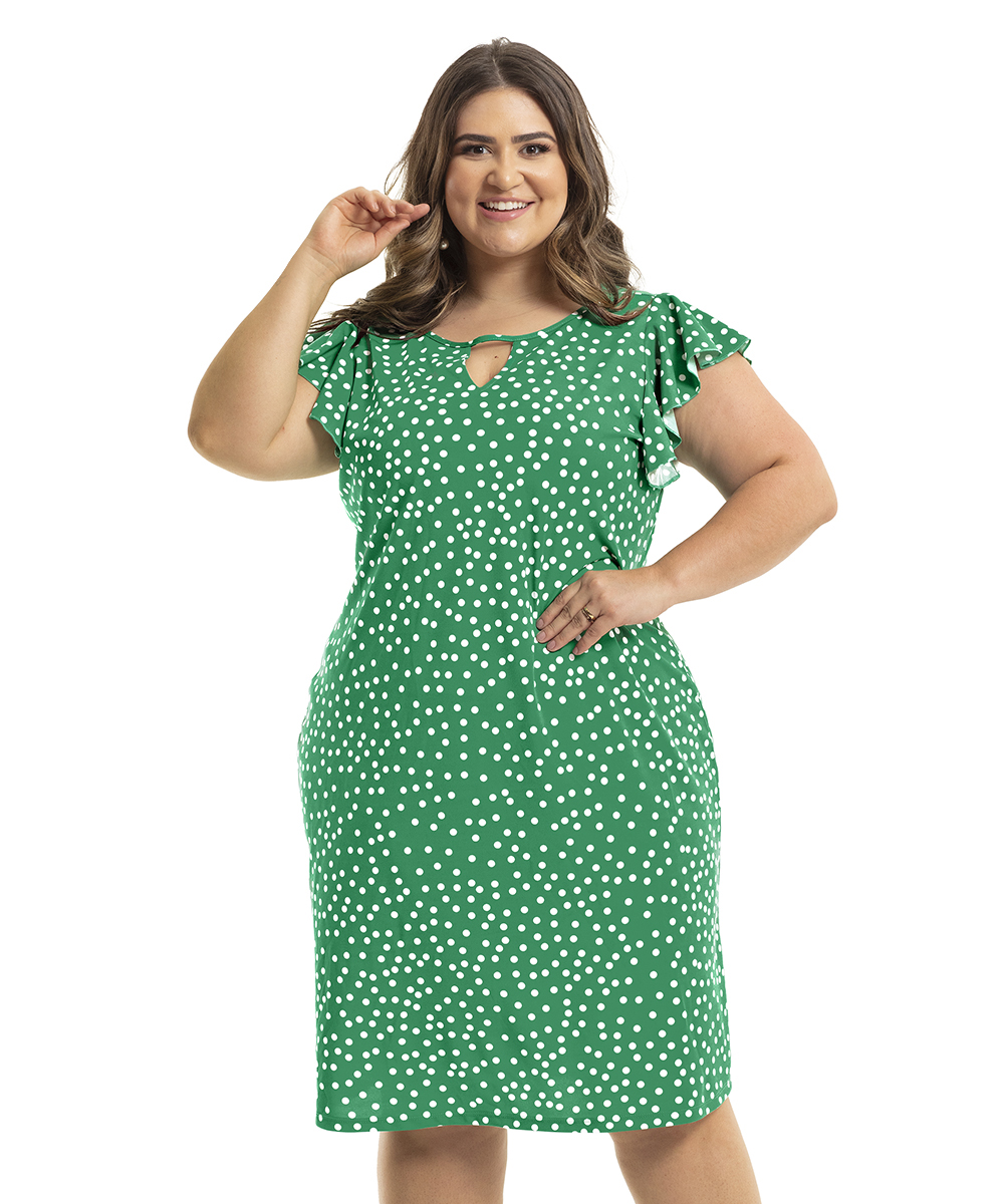Vestido decote com abertura, mangas godê e modelagem reta. Comprimento Clássico.