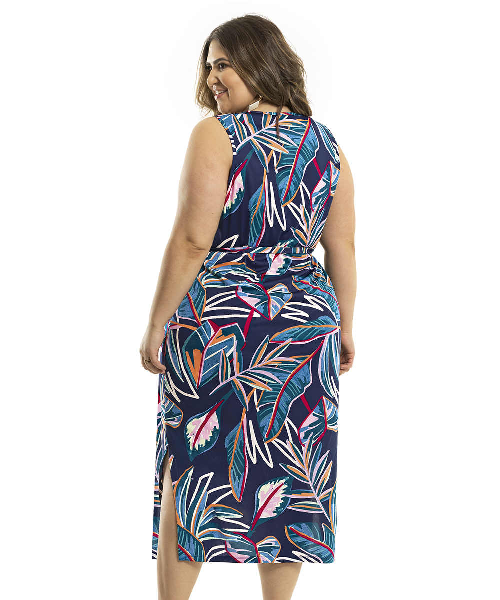 Vestido decote redondo sem manga, modelagem reta, fendas laterais que dão movimento à peça. Acompanha faixa com meia argola para valorizar a cintura. Comprimento Max.