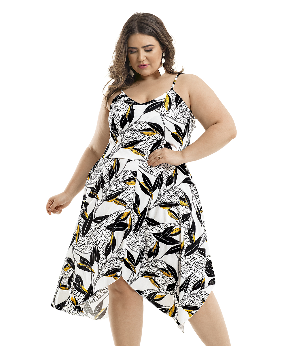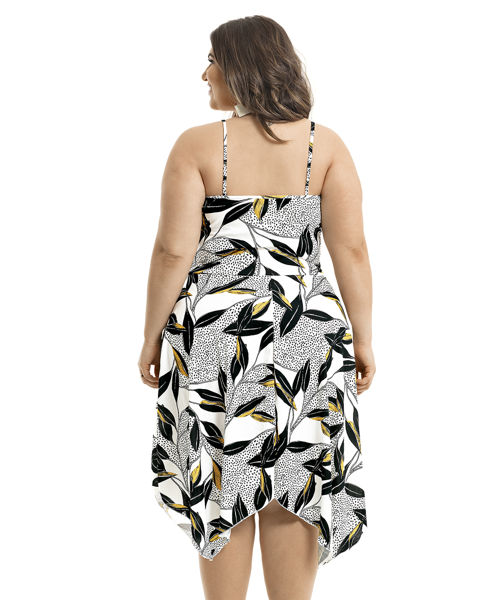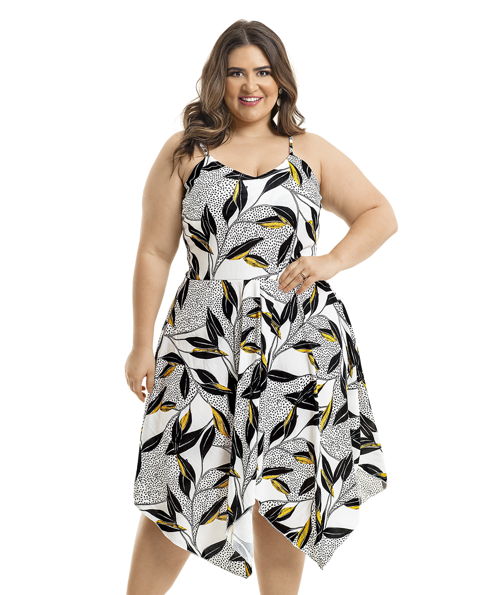 Sua saia é o diferencial nesse vestido super jovem. A saia assimétrica é moderna e fácil de combinar. Esse modelo em comprimento midi alonga a silhueta, além de elegante.Estampa em tons neutros e fácil de combinar.