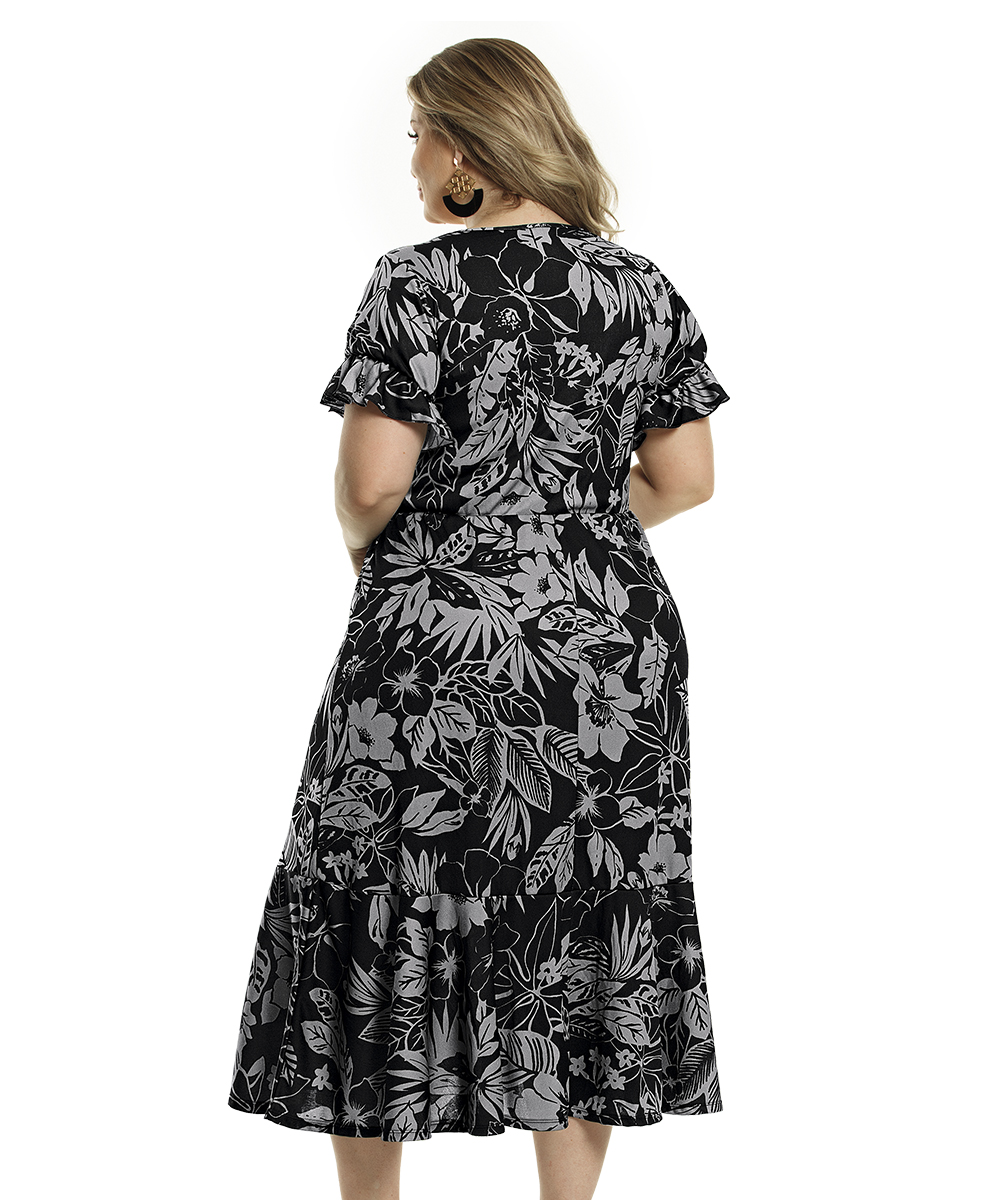 Vestido possui decote V, elástico nas mangas para franzir e modelagem da saia godê com babado. Comprimento Max.