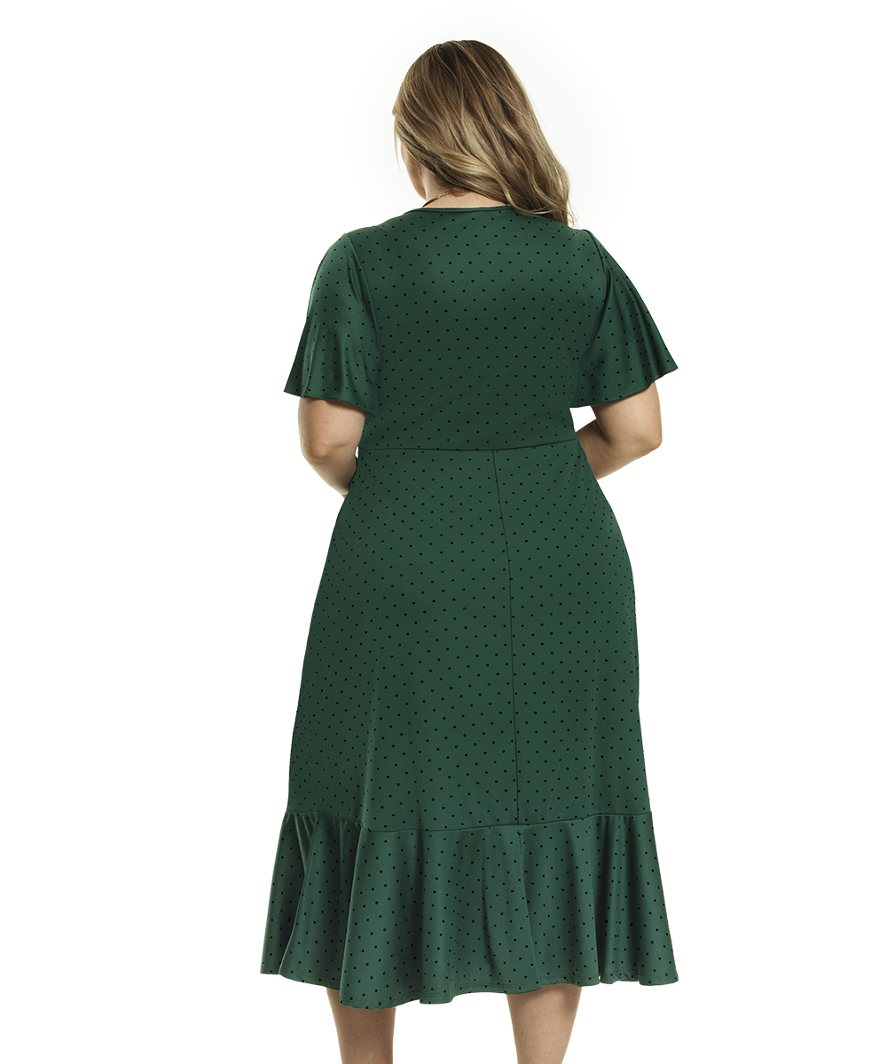 Vestido possui mangas godê, busto forrado, recorte na cintura e saia levemente justa com babado. Comprimento Max.