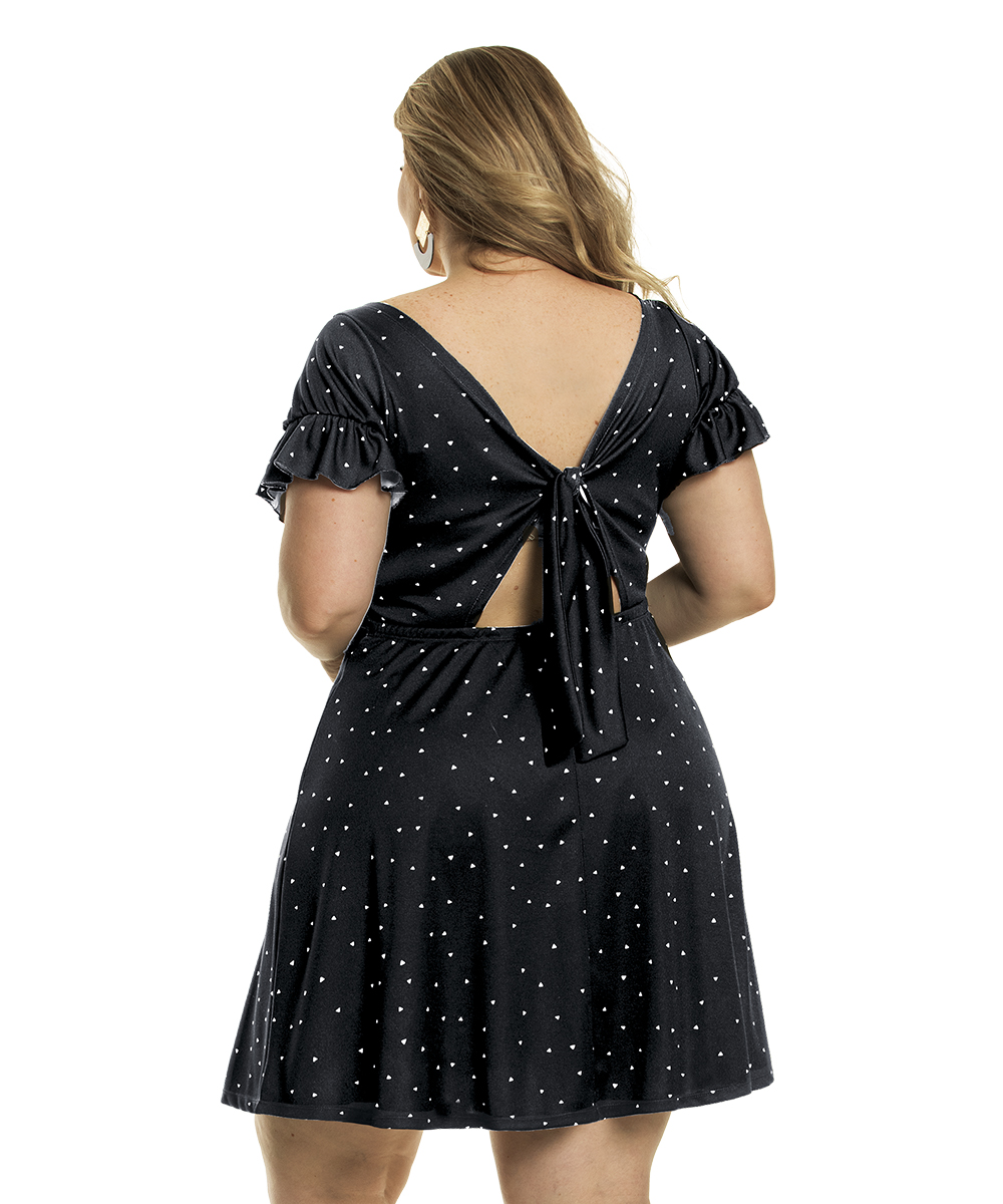 Vestido possui decote canoa com amarração nas costas e modelagem da saia godê. Comprimento Médio.