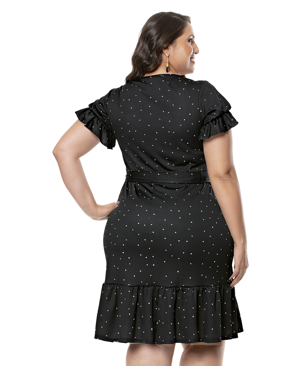 Babados com certeza fazem toda a diferença no look, ainda mais num pretinho em estampa Poá, confeccionado em Jersey acetinado. As mangas e o barrado da saia com babados trazem aquele toque de delicadeza e estilo.