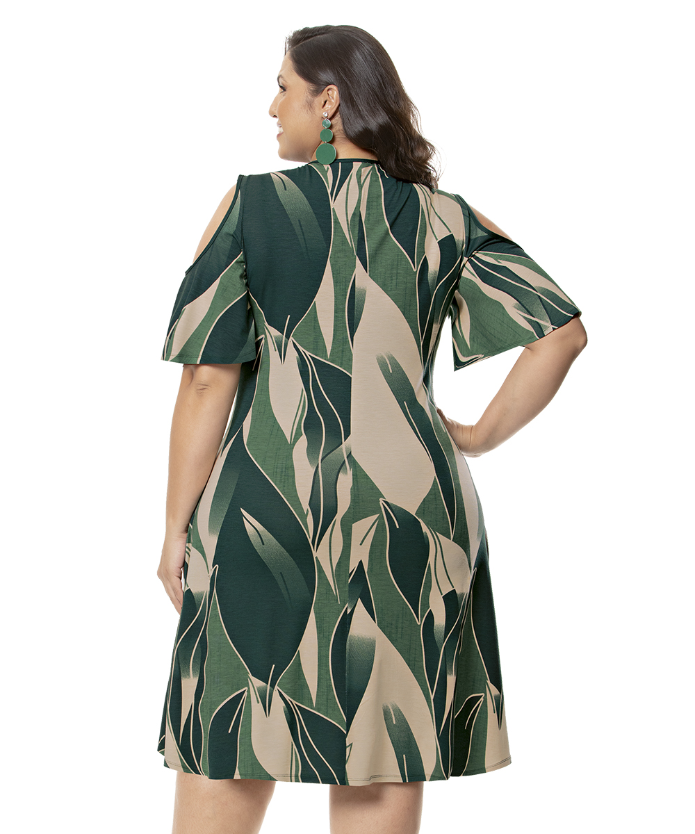 Esse modelo é para aqueles dias que a gente quer se sentir leve, linda e confortável. Confeccionado em Jersey acetinado e com caimento perfeito, esse vestido traz um charme a mais com a estampa em tons de verde e detalhe de abertura nos ombros. É perfeito!