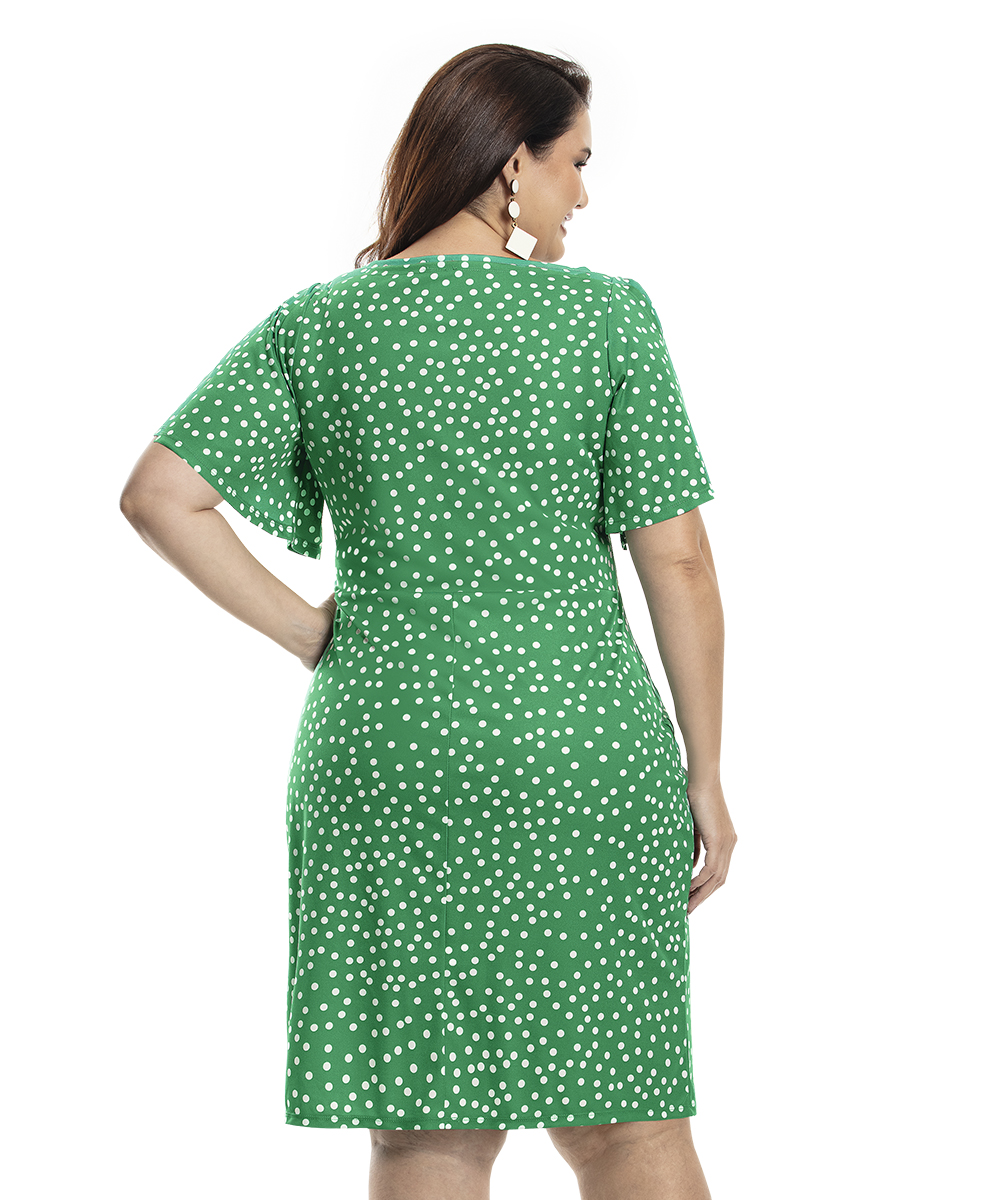 Vestido decote canoa, mangas na dobra do braço com abertura lateral.