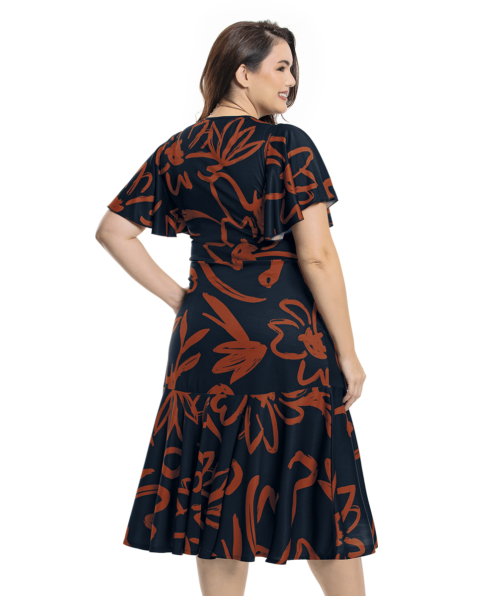 Vestido decote u, mangas godê. Modelagem da saia reta com babado godê.