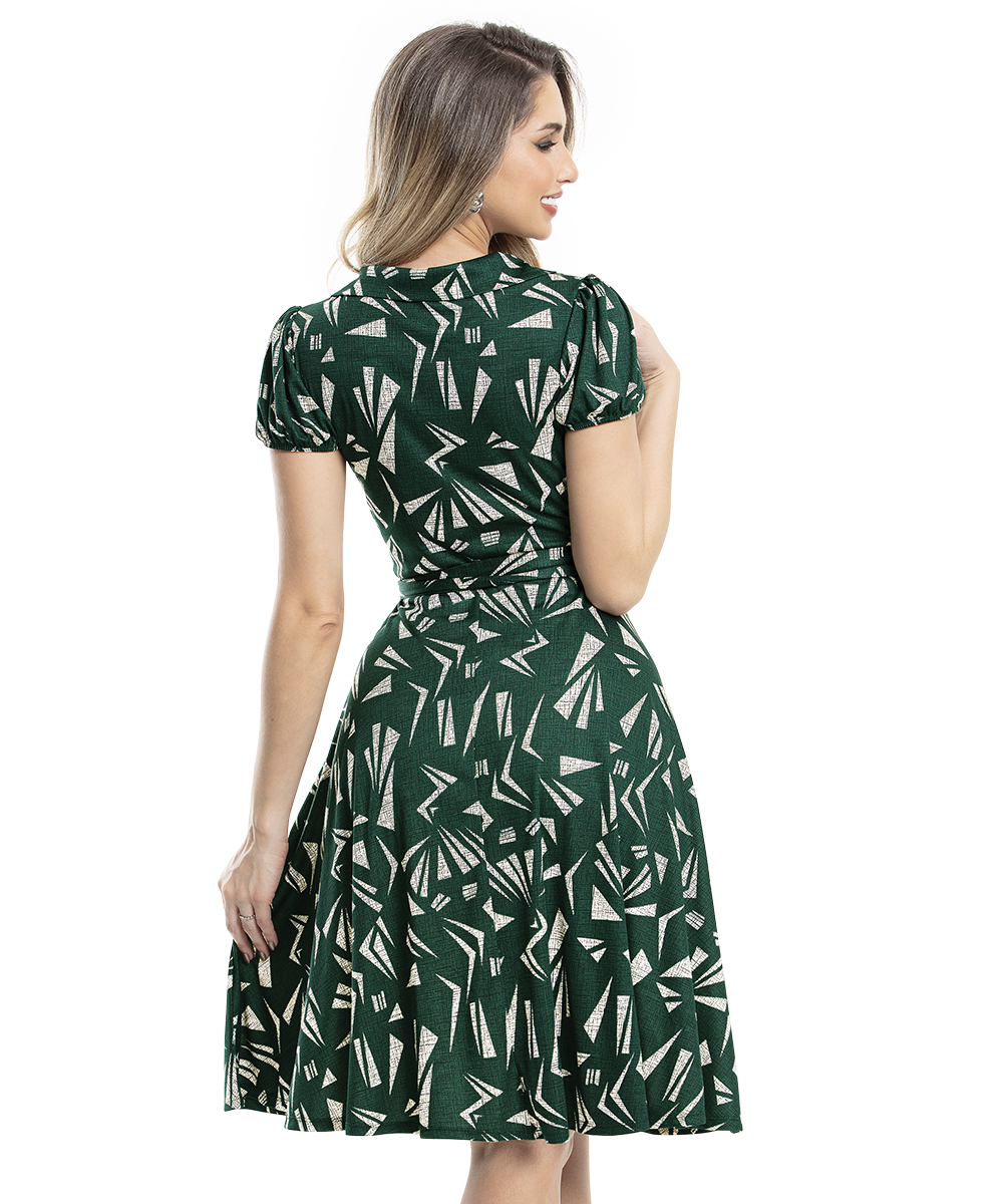Vestido decote v com gola, mangas curtas bufantes, botões decorativos,