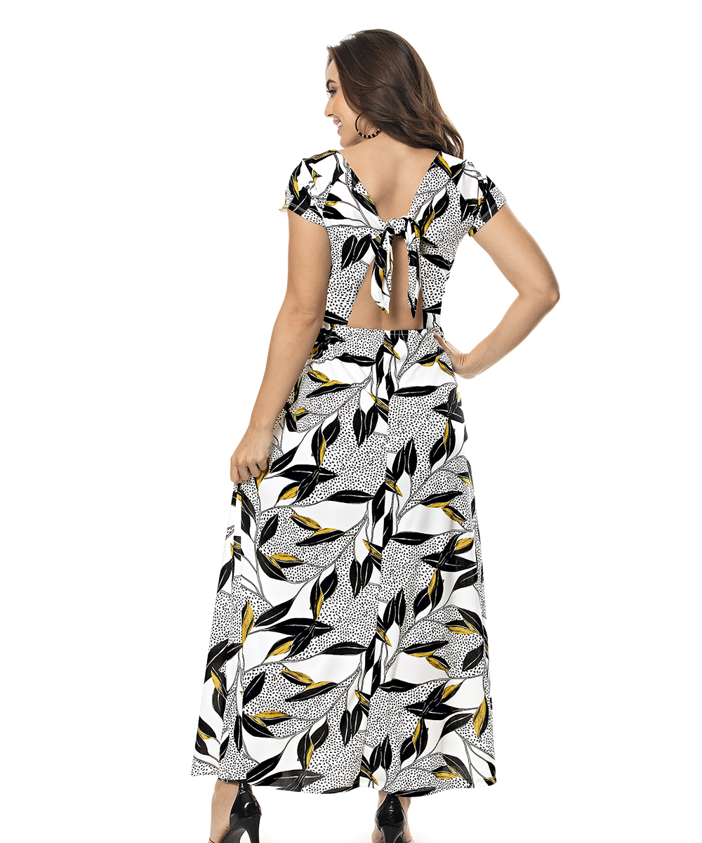 O vestido longo com decote alto, mangas curtas, elástico na cintura, abertura nas costas com faixa para amarração, modelagem da saia rodada com babado, é a escolha perfeita para as ocasiões casuais em que você precisa de conforto sem perder o estilo. Vestido feito em jersey acetinado.