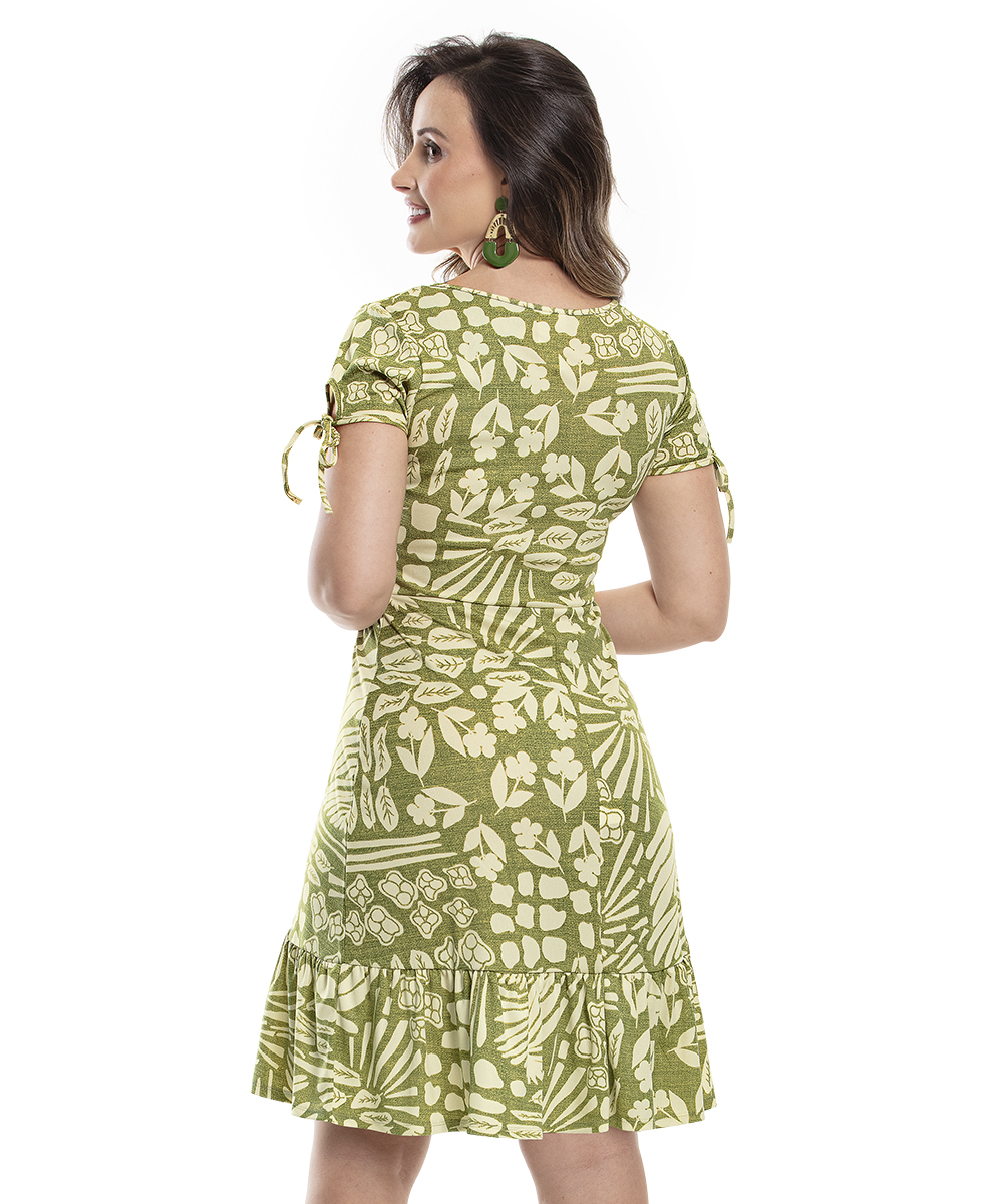 Vestido decote redondo, mangas curtas com abertura para amarração, faixa