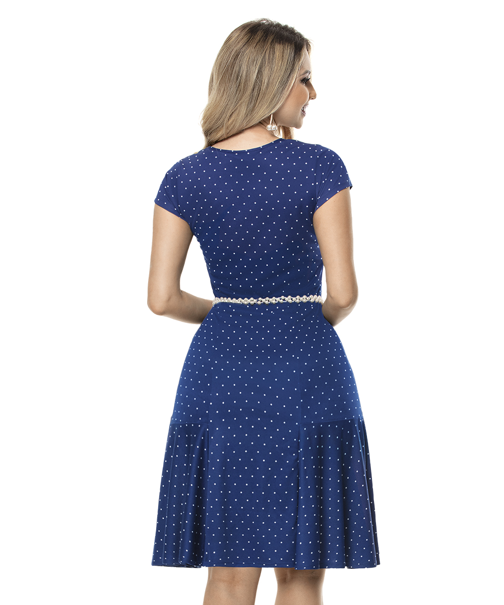Com um decote em coração e estampa Poá num fundo azul, esse vestido é sinônimo de conforto e feminilidade. Combine-o com o cinto para marcar a cintura e ficará lindíssima.