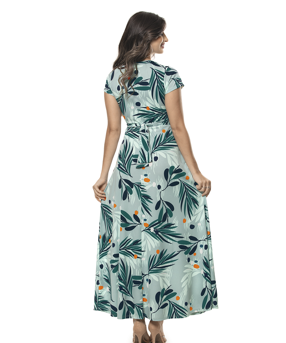 Com muita leveza e feminilidade o vestido com decote redondo, mangas curtas, modelagem da saia godê, comprimento longo e fenda frontal na saia, é o modelo perfeito para as ocasiões mais casuais onde você procura elegância e conforto. Vestido feito em jersey acetinado.
