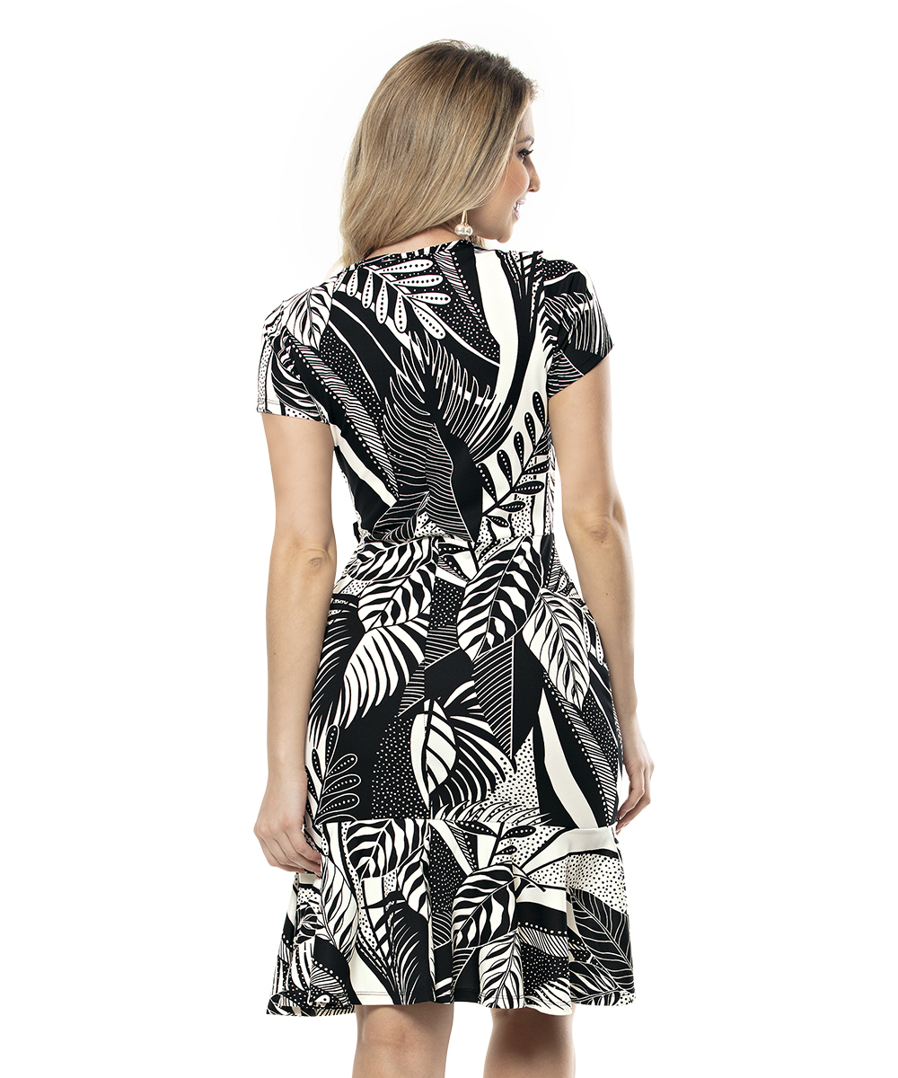 O modelo clássico com estampa de folhagem é a combinação ideal para quem aposta num look sóbrio com uma pitada elegante. Com a modelagem justa, possui argola na cintura e babados na saia que valorizam ainda mais o modelo.