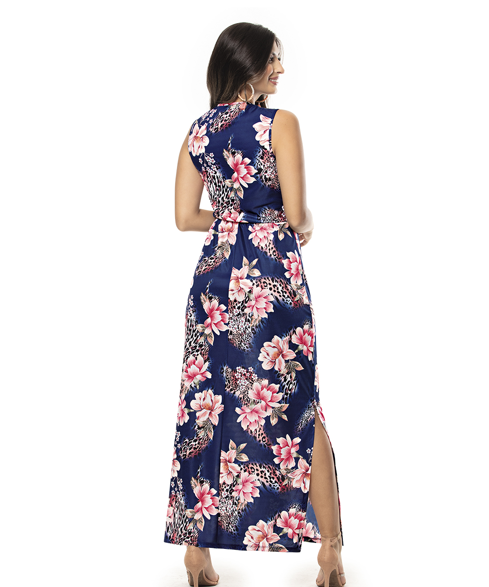 Possui decote U mais profundo, alças largas estilo regata, faixa embutida na cintura e modelagem da saia levemente justa ao corpo. Comprimento Longo.