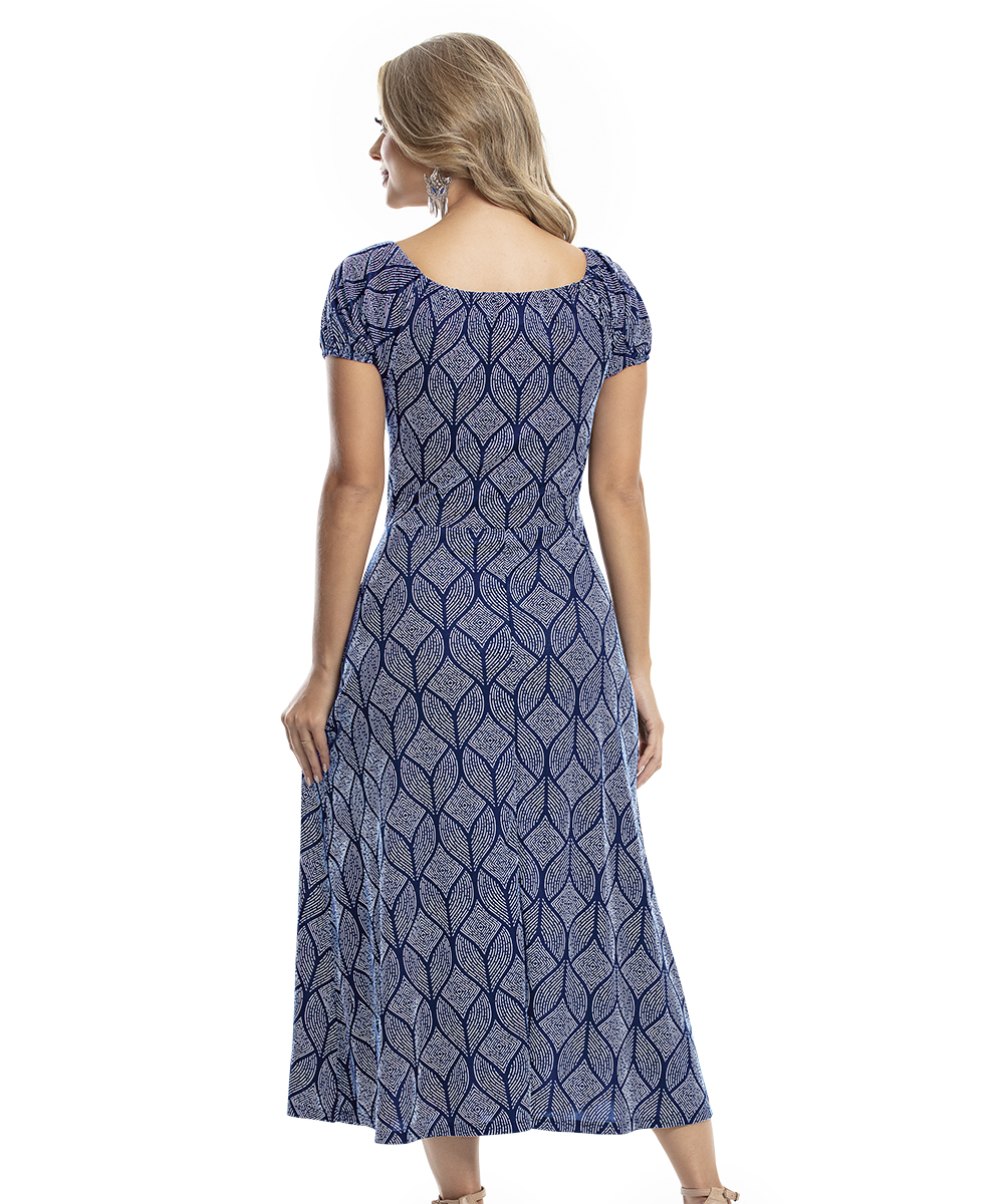 Vestido decote canoa com regulador, mangas curtas raglan, pala na cintura.