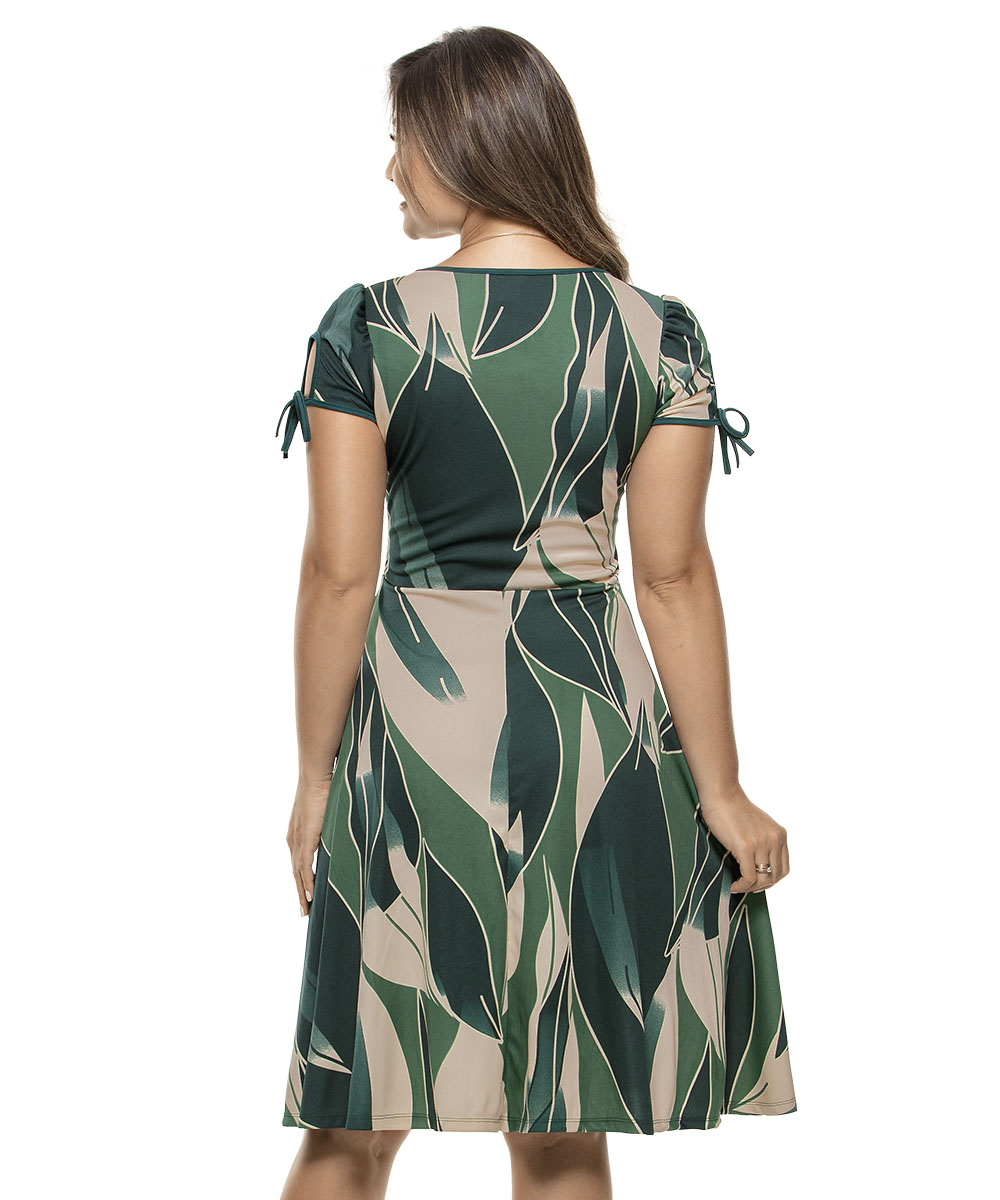 Este vestido em jersey acetinado é a escolha ideal para quem busca um visual elegante com um toque tropical. Sua modelagem moderna é versátil e se adapta a diversas ocasiões. Com um decote redondo, mangas curtas com galão para amarração e modelagem da saia godê, o vestido é acentuado por uma faixa para amarração na cintura, garantindo um ótimo caimento. O comprimento clássico é perfeito para quem busca um visual sofisticado.
