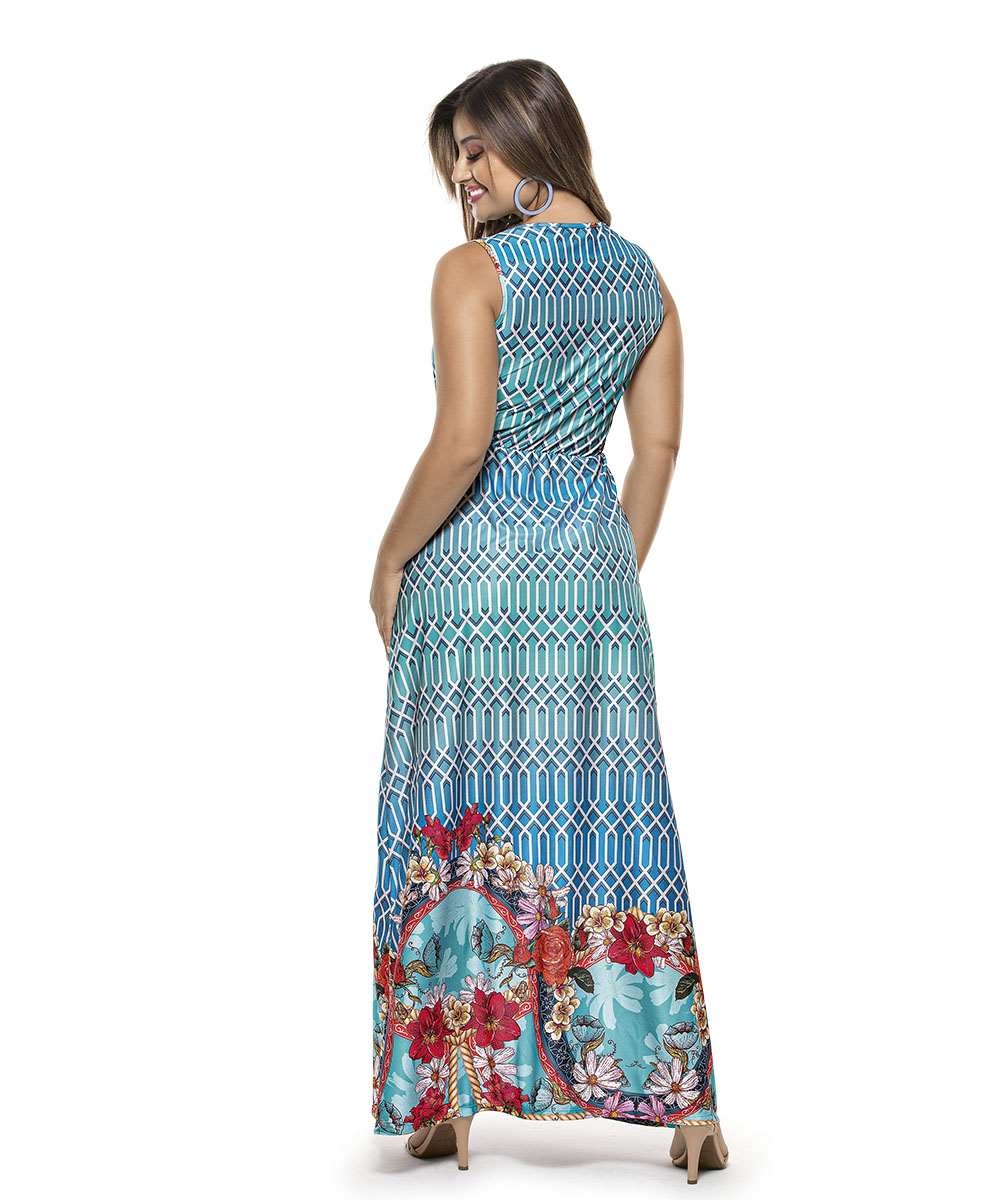 Vestido sem mangas, possui decote redondo, elástico na cintura para franzir, fenda frontal e modelagem da saia godê. Comprimento Longo.