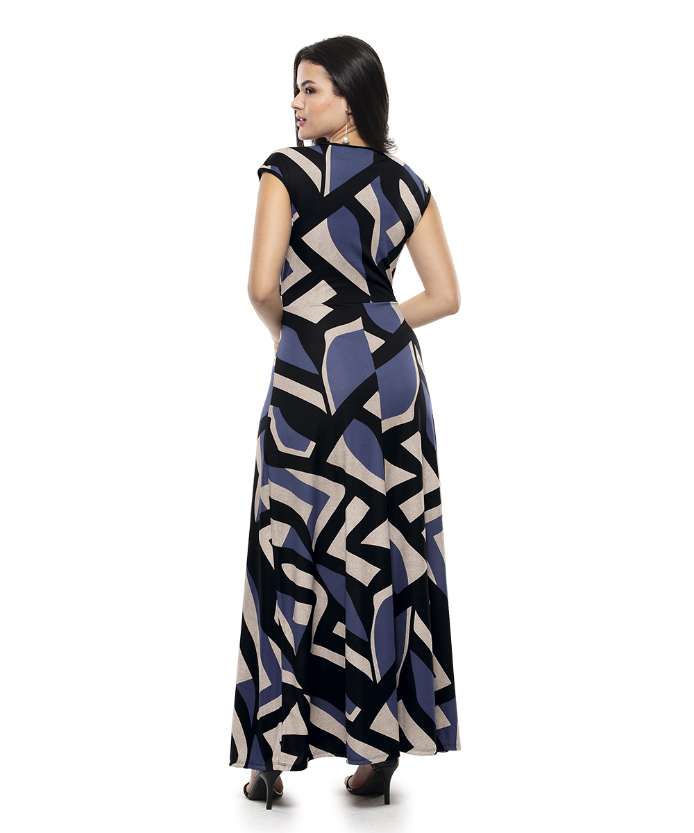 Vestido com decote redondo, mangas japonesas e cinto falso na cintura. Modelagem da saia godê. Comprimento Longo.