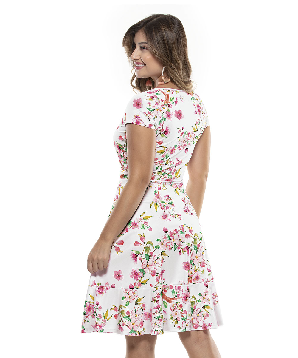Possui decote redondo, mangas curtas e modelagem da saia godê com babado. Comprimento Clássico.