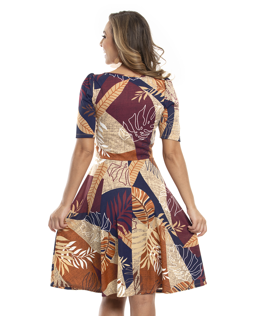 Abraçando a estação com elegância, nosso vestido apresenta uma estampa de folhagem clássica, com cores que são a cara do outono! Vista-se para a sofisticação e a beleza natural da temporada.