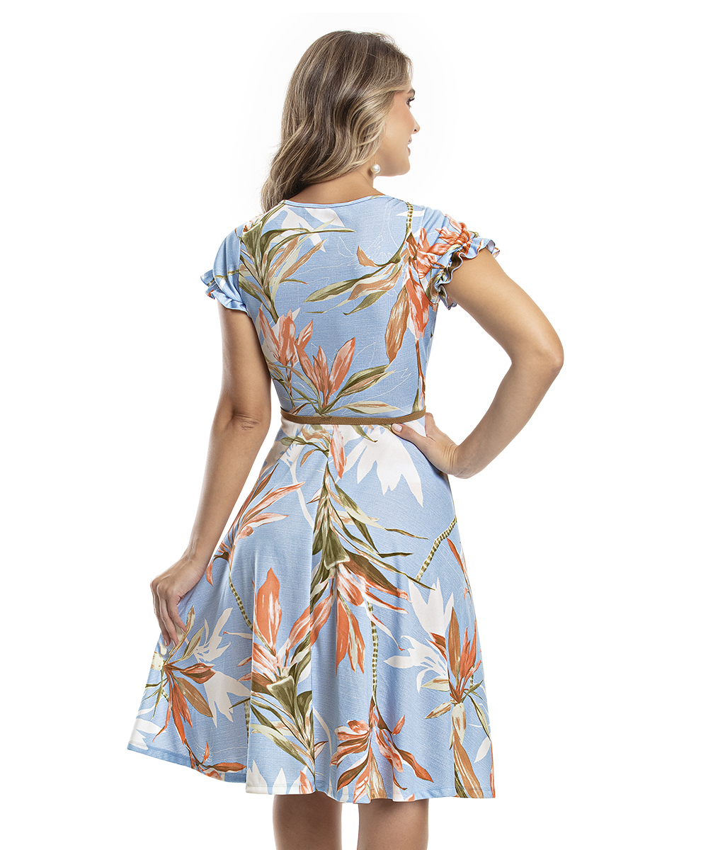 Vestido decote reto, mangas curtas com babado na barra para efeito